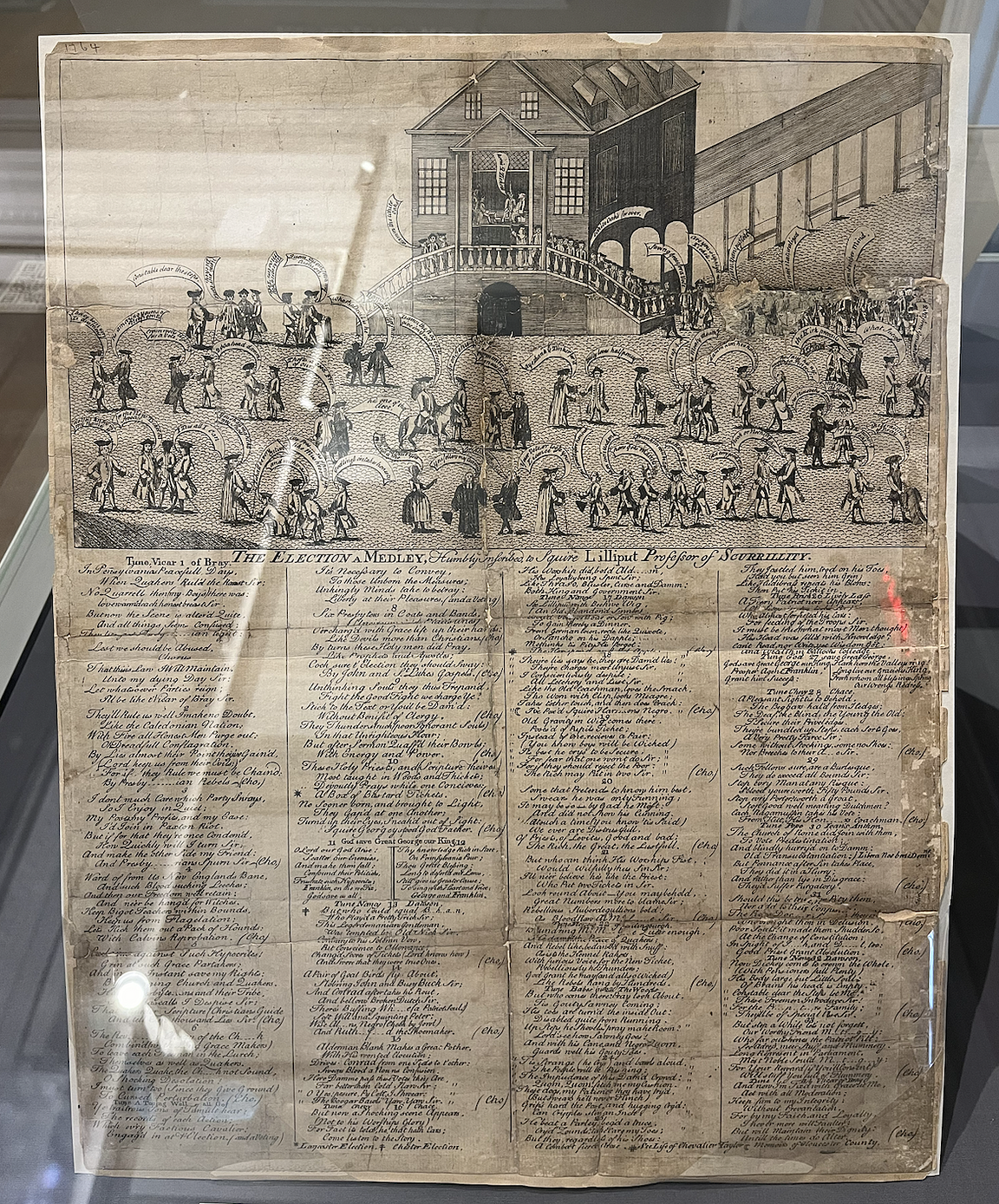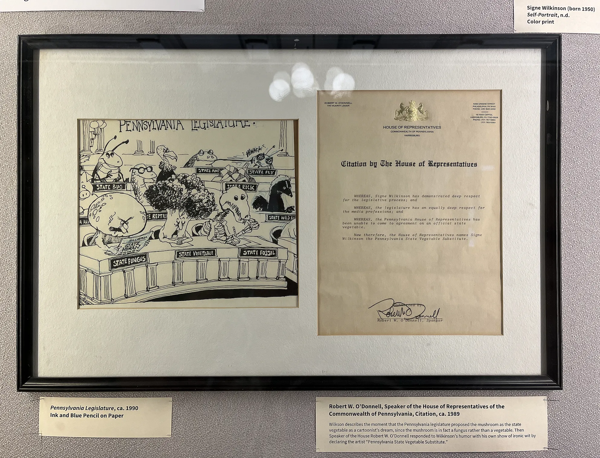 In addition to showcasing primary-source cartoons published in Pennsylvania, across America, and in London regarding Colonial politics as well as political pressures immediately before and after the American Revolution, the historical society exhibit displays political artworks by editorial cartoonist Signe Wilkinson, a Pulitizer Prize-winning artist known best for her work at the Philadelphia Daily News.