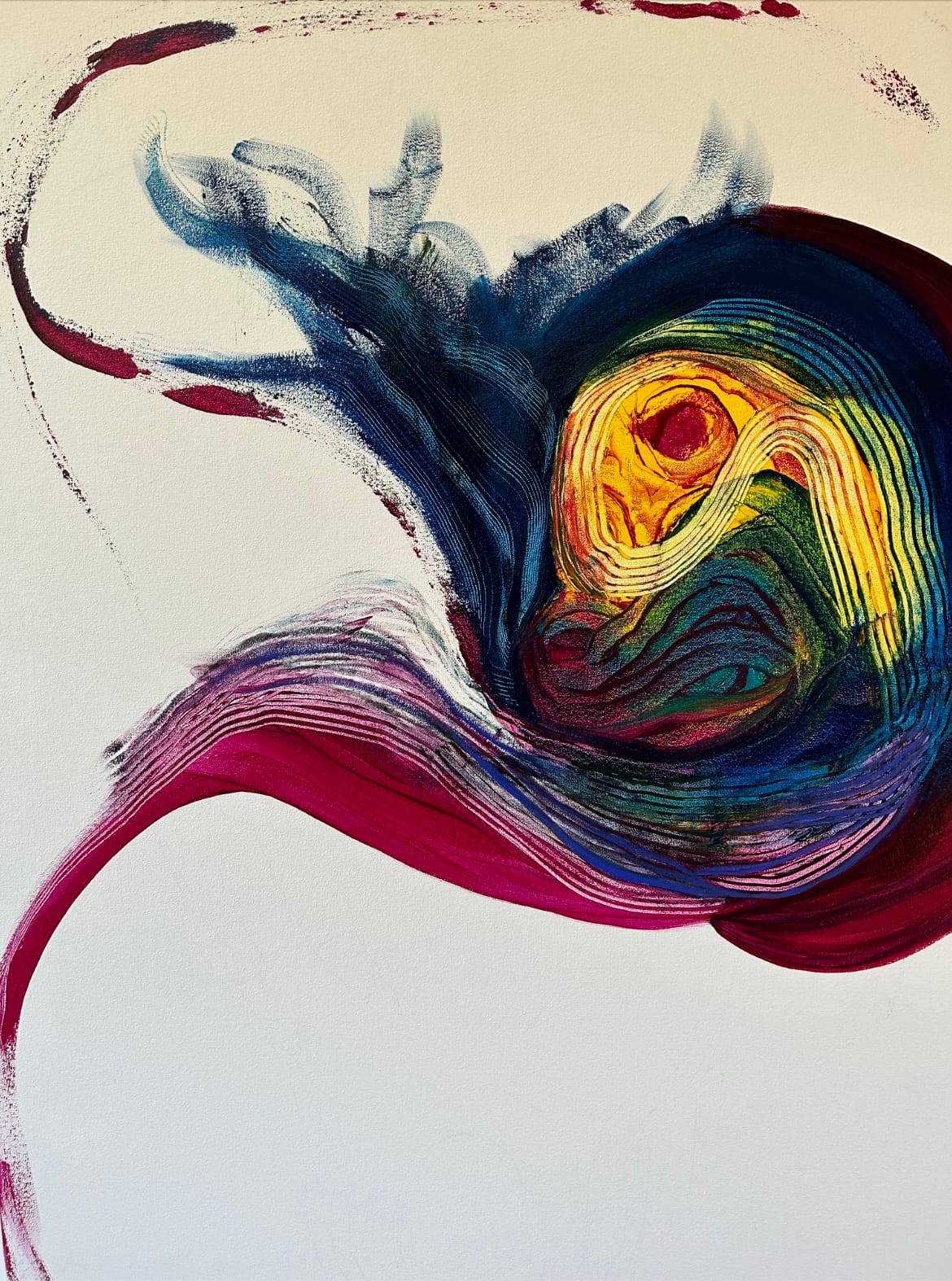 As I continued to gaze, what I saw at first as flower bulbs began to take on the shape of birds, particularly the blue-green bulb in the lower left and the green-white bulb to the center right. Okay, now I was getting into it, I thought. I was beginning to see something I hadn’t seen before. Perhaps this was the beginning of stepping through the portal, of a transformational moment between me and the art.