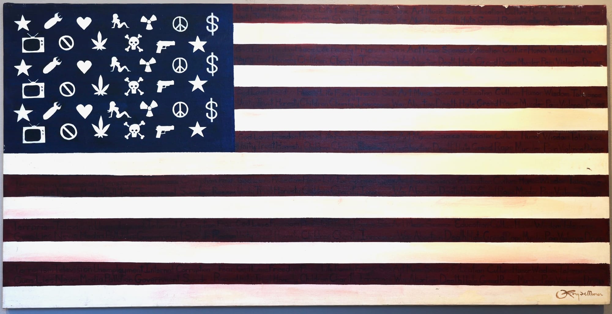 The works on the walls, however, have enough energy to be their own celebration, and source of contemplation. Rory D.L. Mooror's intense take on the American flag evokes the cover of Sly and the Family Stone's There's a Riot Goin' On with its replacing of the traditional stars with more playfully ambivalent iconography. Look a little closer and there's writing in the stripes, concepts jumbling together. One run reads "friends, sex, art, music, science, education"; another reads "war, abortion, death, hate, greed, rape." All of the above swirls around in the American zeitgeist. How do we make sense of it? Or do we just try to survive it?