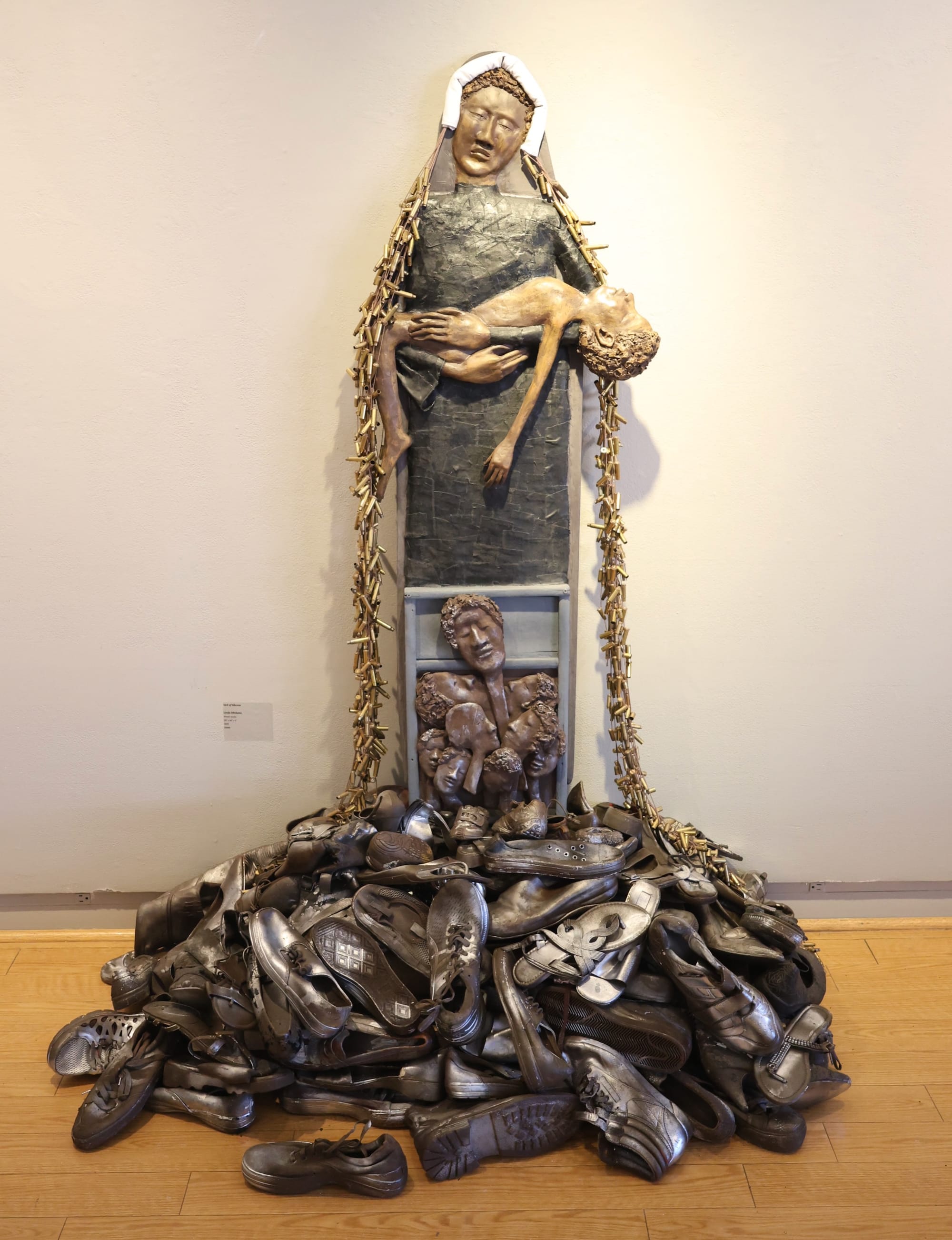 Some pieces evoke raw cries of pain, like Linda Mickens's Veil of Silence. The figures make the subject all too clear, that it's about the killing of human beings before their time, the implication that they're almost sacrificial offerings, made to some horrible deity at a cost that's way too high. The shoes only add power. They are the craggy hill the figures climb, but they also connote a sense of the nameless dead in a long struggle, with a casualty list mounting faster than we can keep track of.