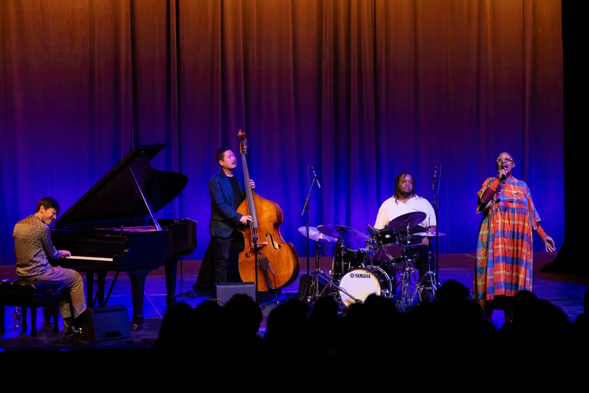 On Saturday at Yale's Schwarzman Center, Salvant stepped onto a temporarily-constructed stage in “Commons” dining hall, which had been transformed into a performance venue through a multi-day effort that required clearing the usual tables and condiment stations and replacing them with floor-to-ceiling curtains and risers seating approximately 400. (“My dream is to go to Yale,” Salvant remarked early in the set. “I want to have a backpack in the cafeteria. Is there a cafeteria?” To which the crowd replied, “You’re in it!”)