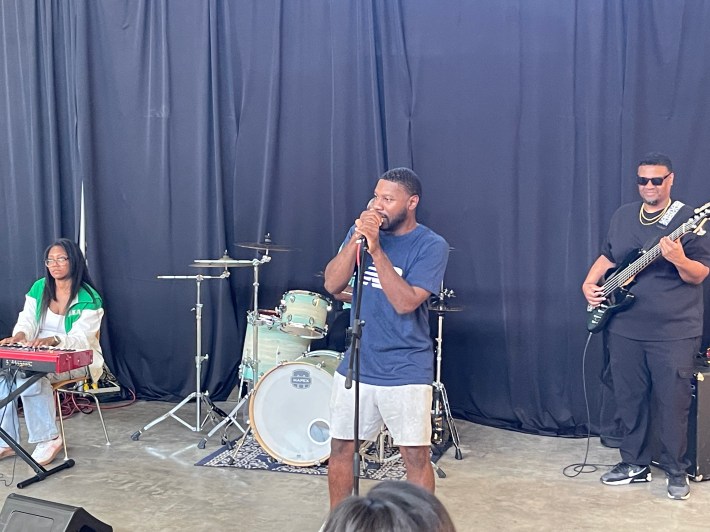 Before the big-name collabs, Mitchell started his art career as a rapper and producer, making music at a time when it wasn’t cool to say you were a Tulsa artist, and when venues didn’t want to book local hip-hop acts. Today, he’s providing his own platforms for Tulsa hip-hop artists. In addition to djnoname., this event featured Keeng Cut—an artist with a style as funky and flavorful as the art that Mitchell creates—performing a two-part act with a three-piece band called The Rowlands. Showcasing his “Flavio Cútatore” alternate persona, he coddled the microphone like a ‘60s Motown artist, bending his words around each bar like molten glass.