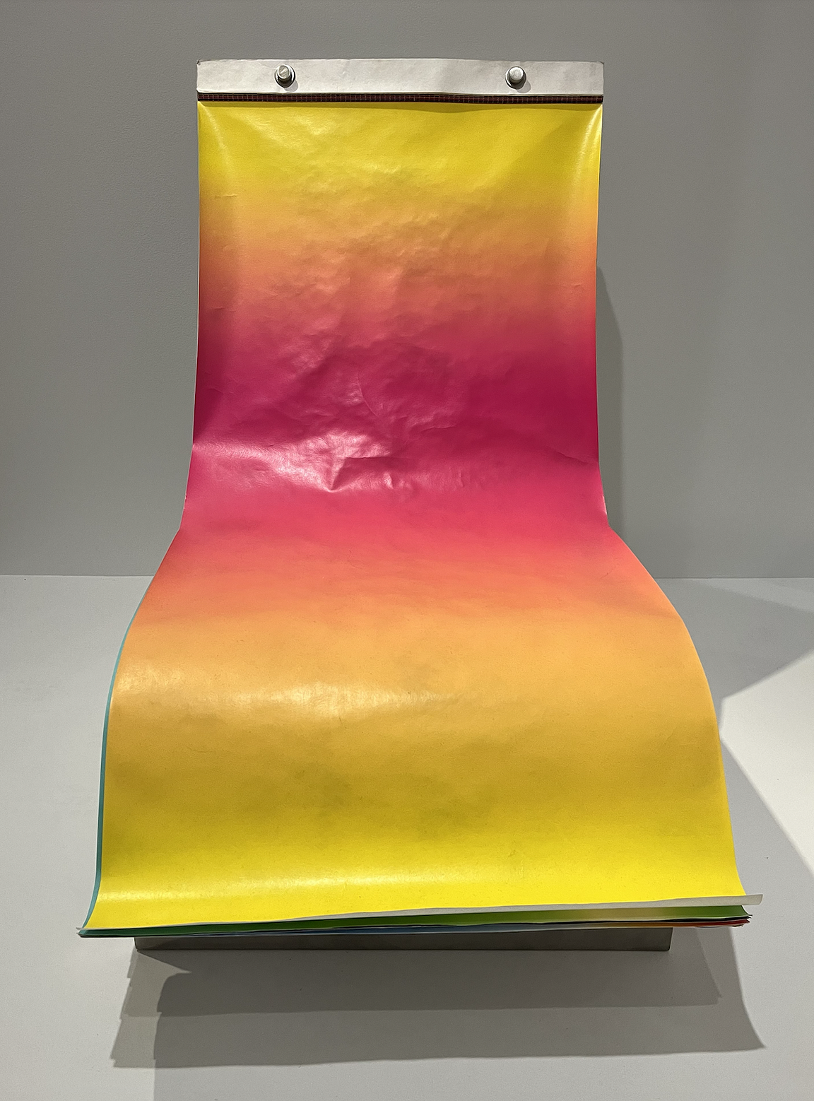 The “Darwin Chair,” crafted by Austrian designer Stefan Sagmeister in 2010, is a lounge chair covered in 200 sheets of paper printed with different patterns and colors that, all seen together, allegedly “tell the story of the creation of the universe.” The interactive design allows sitters to flip over or rip off the cover like one piece in a giant pad of paper — providing a new look once the old gets tired or dirty. I don’t really know what the story of the universe is, let alone what it looks like, but the pink ombré slip seen on the chair last Sunday stood on its own, regardless.