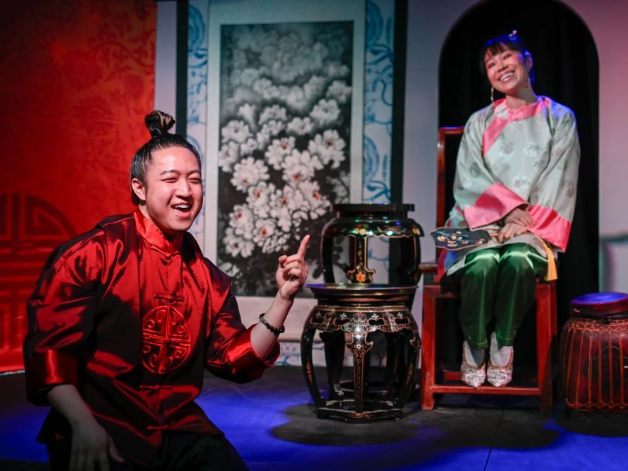 Director Jeremy Stevens and assistant director Veronica Smith, both white, recognized the necessity of a process that centered Chinese voices. As the creative team discussed in a post-show Q&A, they worked collaboratively with the actors, both of Chinese origin, who took the lead on many decisions — for instance, selecting historically accurate set and costume pieces, ensuring that every bow and gesture was culturally authentic, and choosing to speak parts of the script in Chinese instead of English (giving the largely white audience a bracing taste of what it’s like to be the “other” in the room). Stevens’ call to reconfigure the 50-seat space so audience and actors would meet each other head on, at close quarters, created a usefully uncomfortable sense (for everyone) of being boxed in within the micro and macro structures the play explores: a room within a room, where genuine contact is both close and far away.