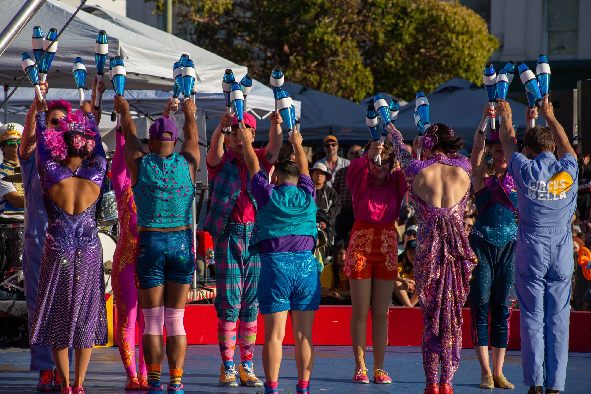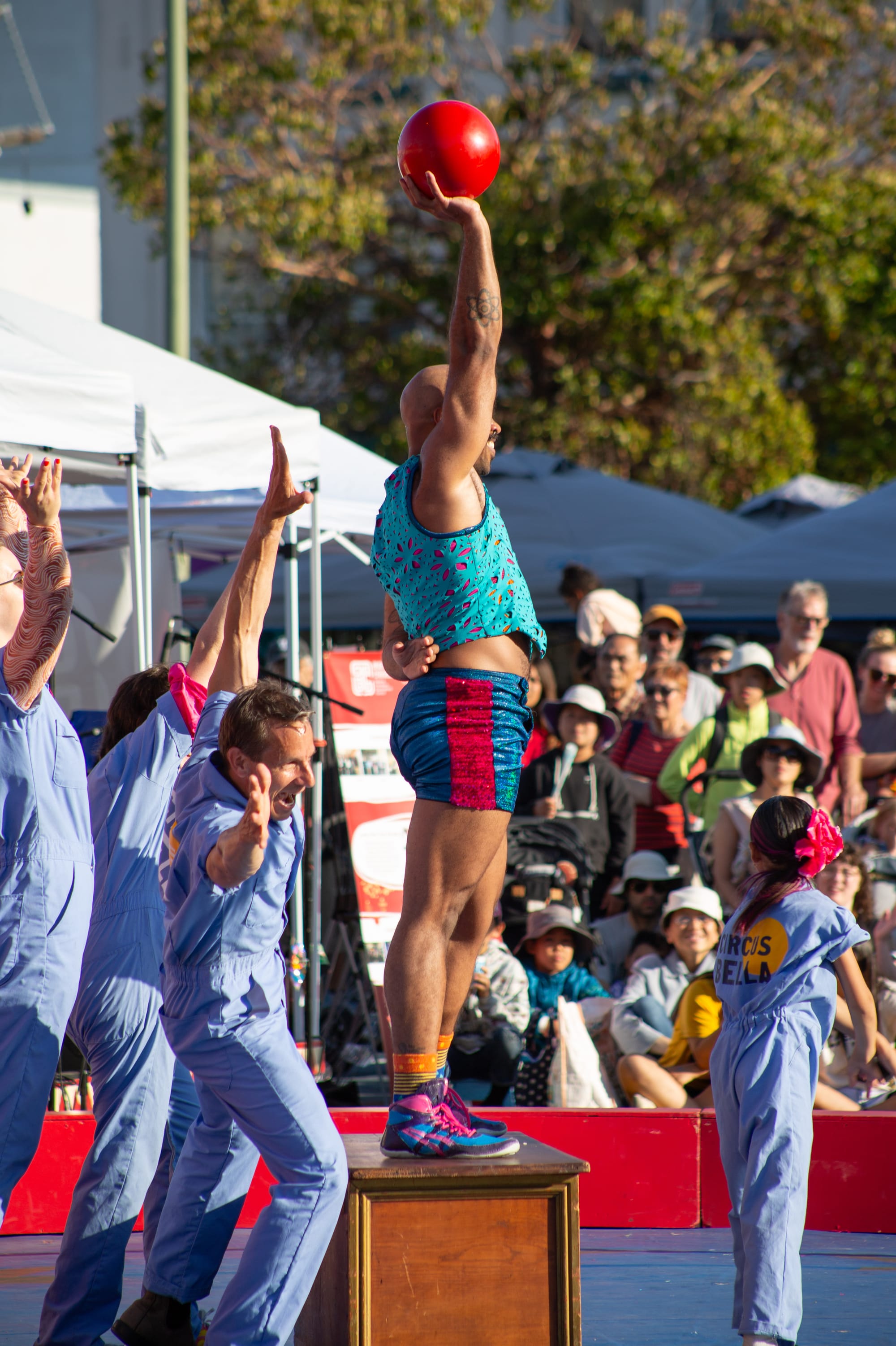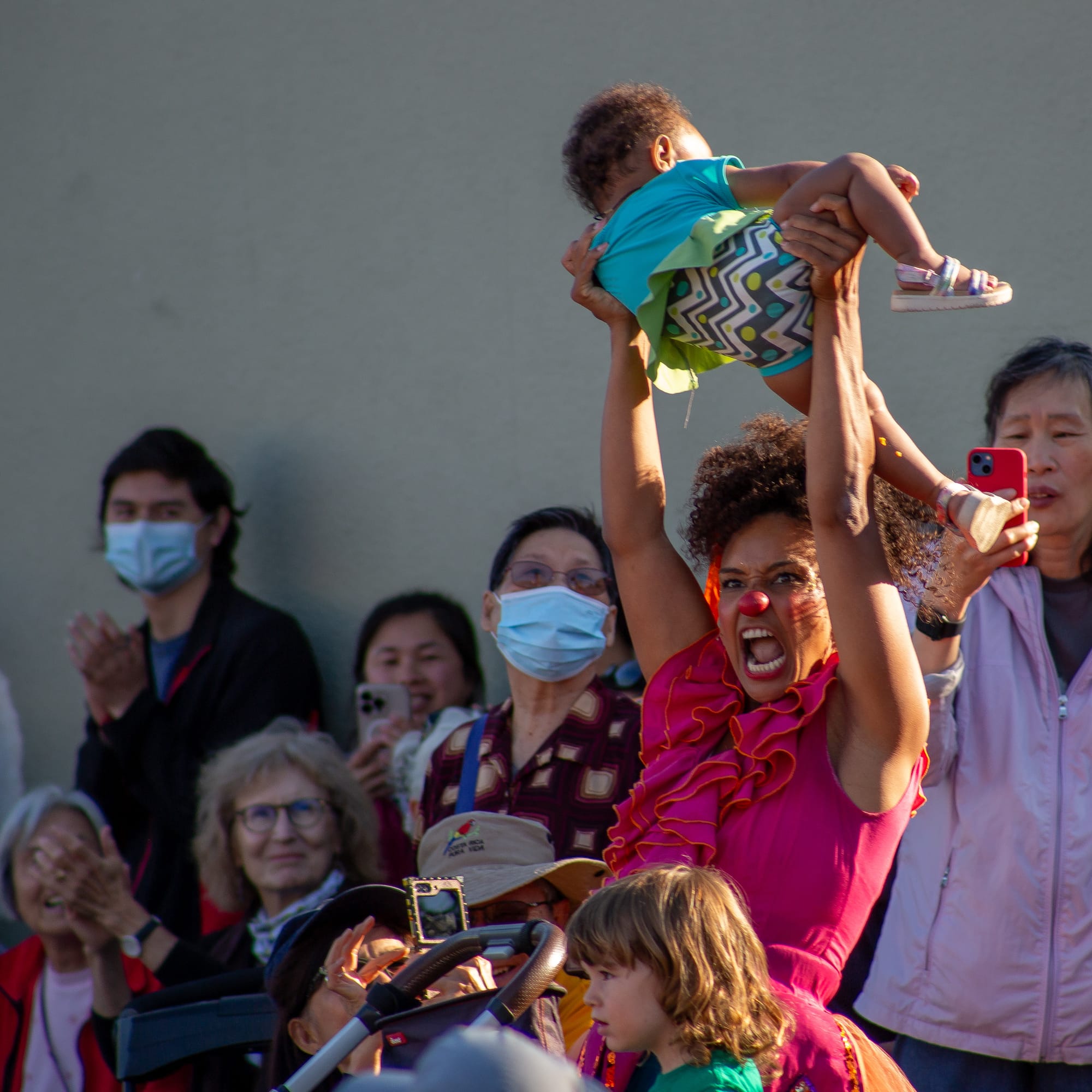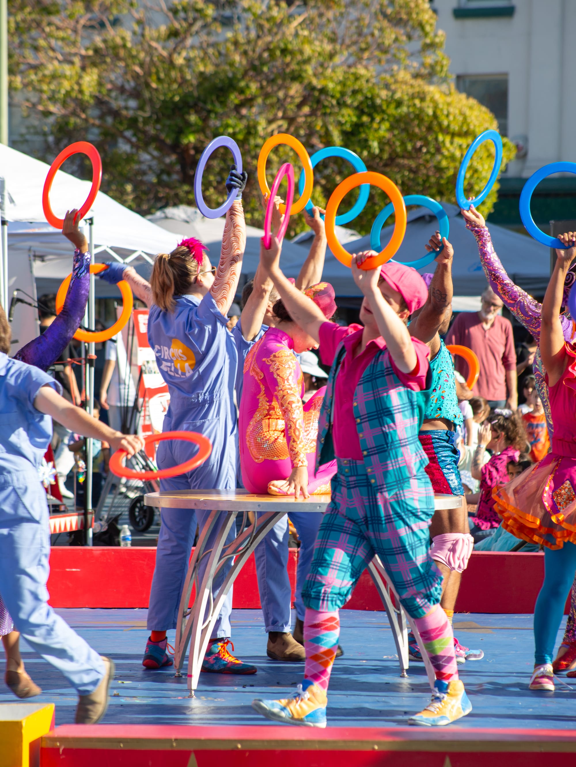 On this evening, as part of their summer series of free events in parks around the Bay Area, the company performed for an absolutely packed audience in Chinatown’s Lincoln Square Park. Attendees of every age stood, sat, and perched from the highest places they’d be held, for an hour-long show of colors, sequins, goofiness, and giggles.