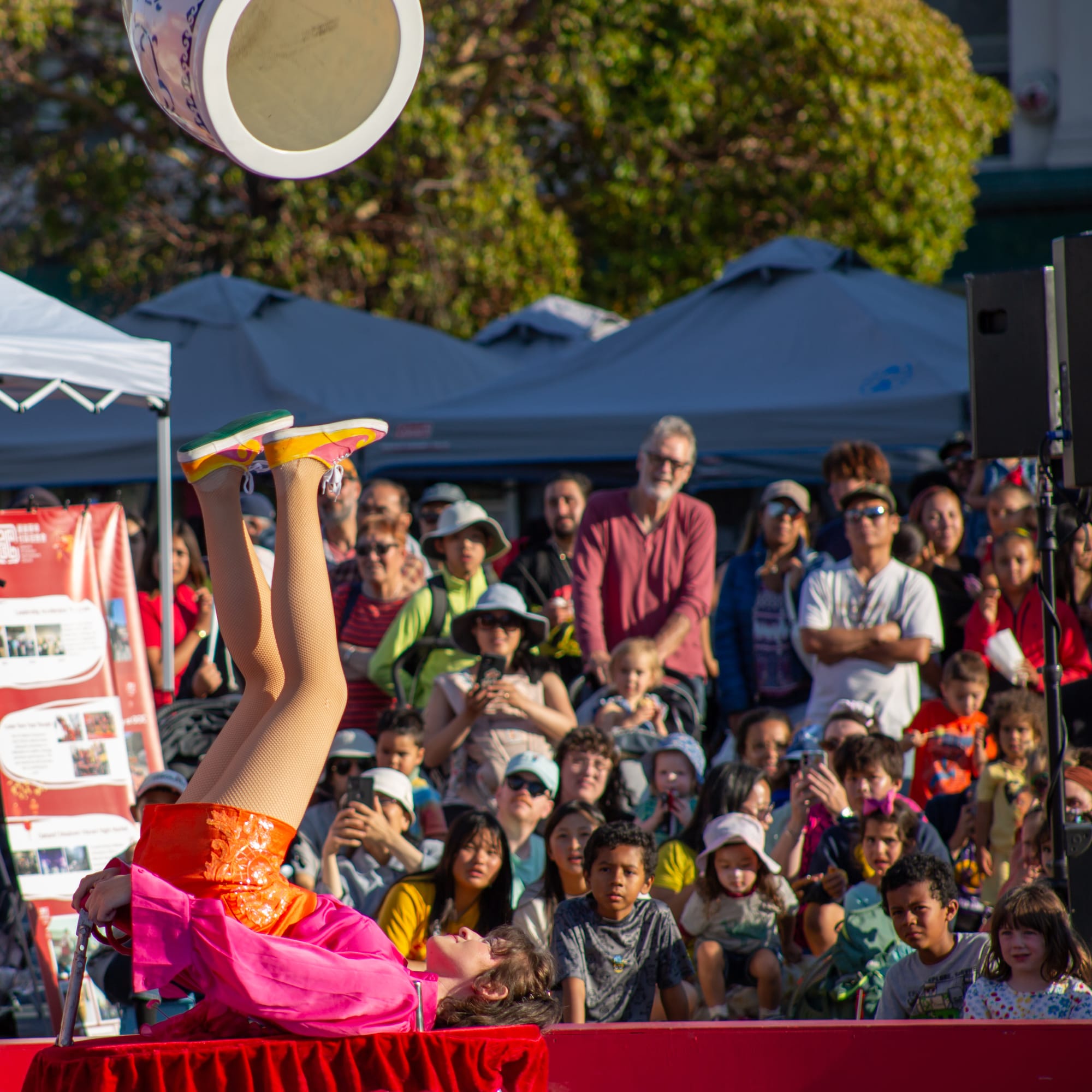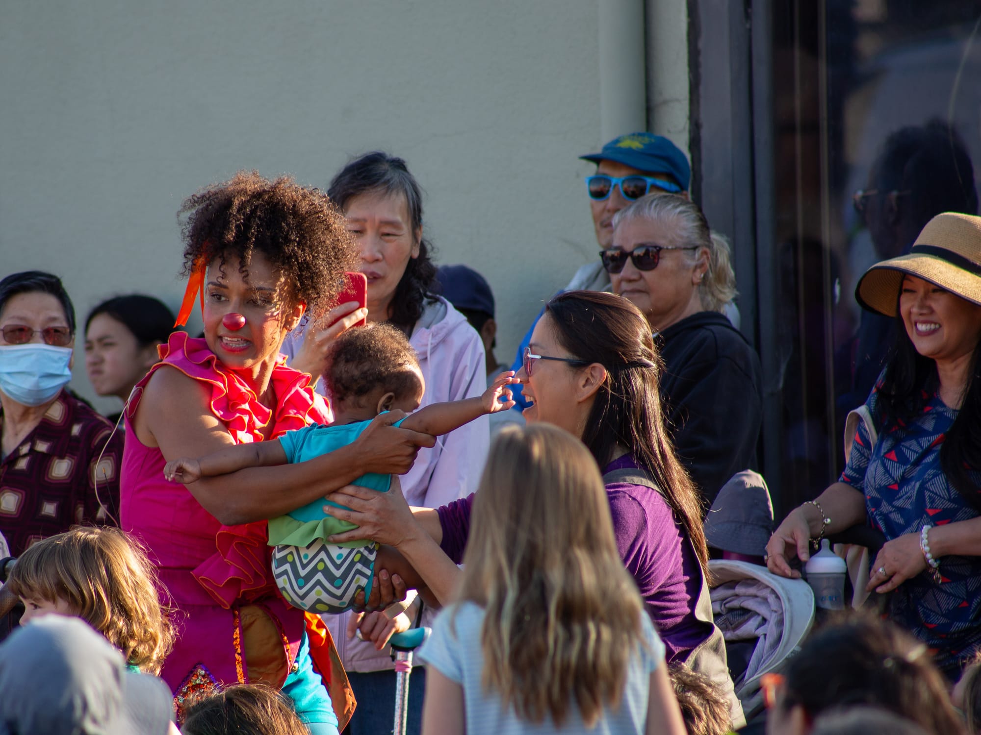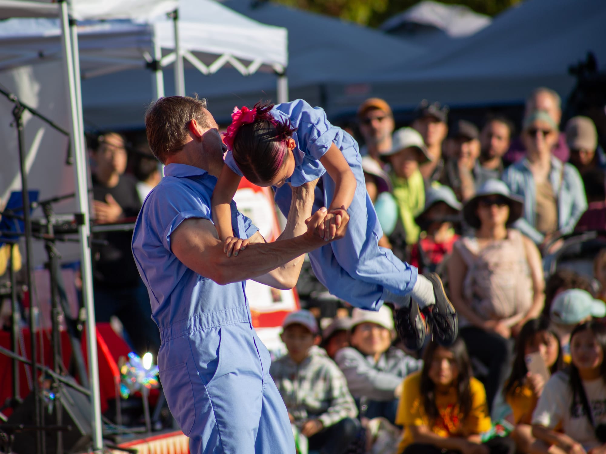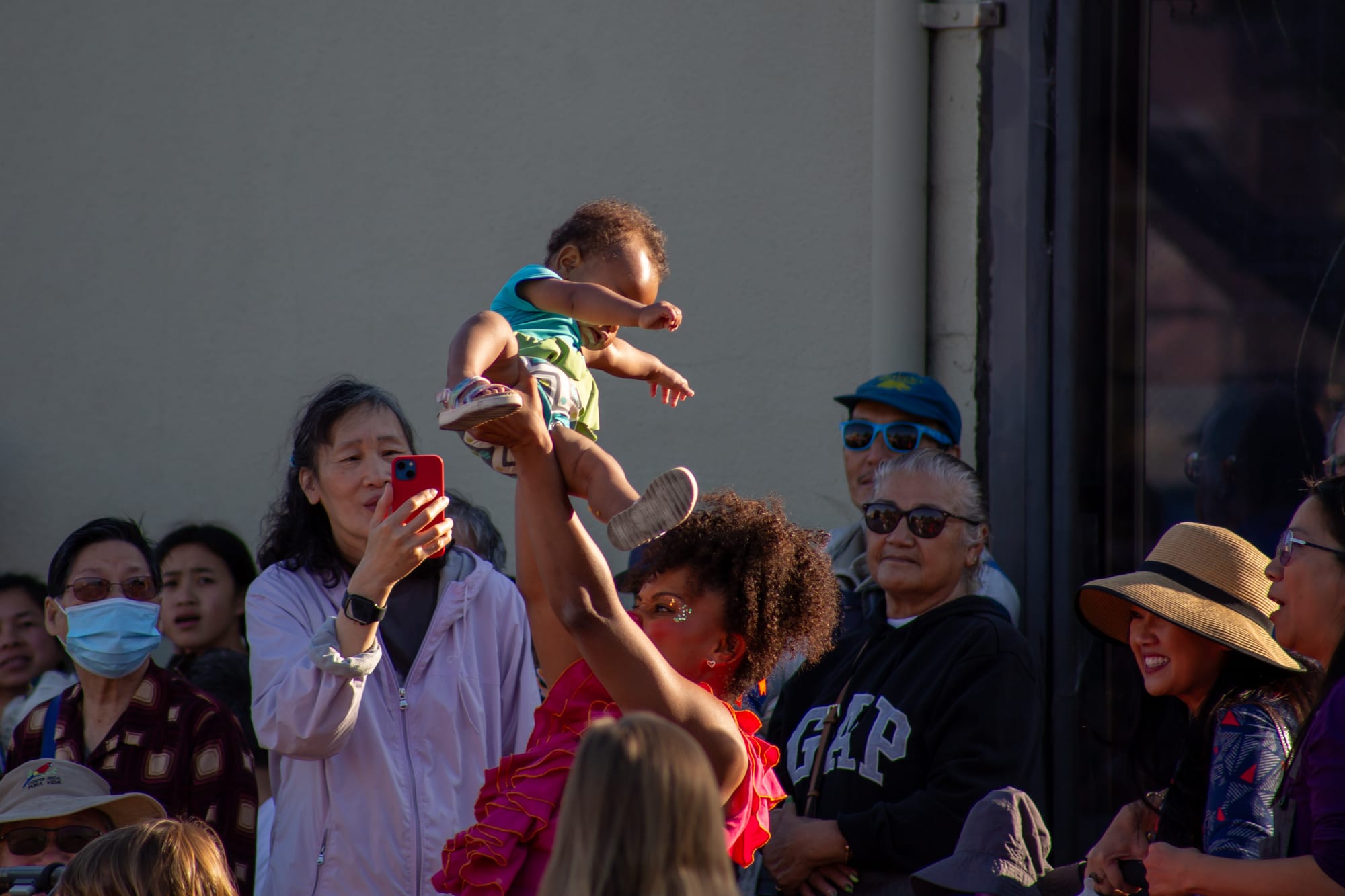 On this evening, as part of their summer series of free events in parks around the Bay Area, the company performed for an absolutely packed audience in Chinatown’s Lincoln Square Park. Attendees of every age stood, sat, and perched from the highest places they’d be held, for an hour-long show of colors, sequins, goofiness, and giggles.