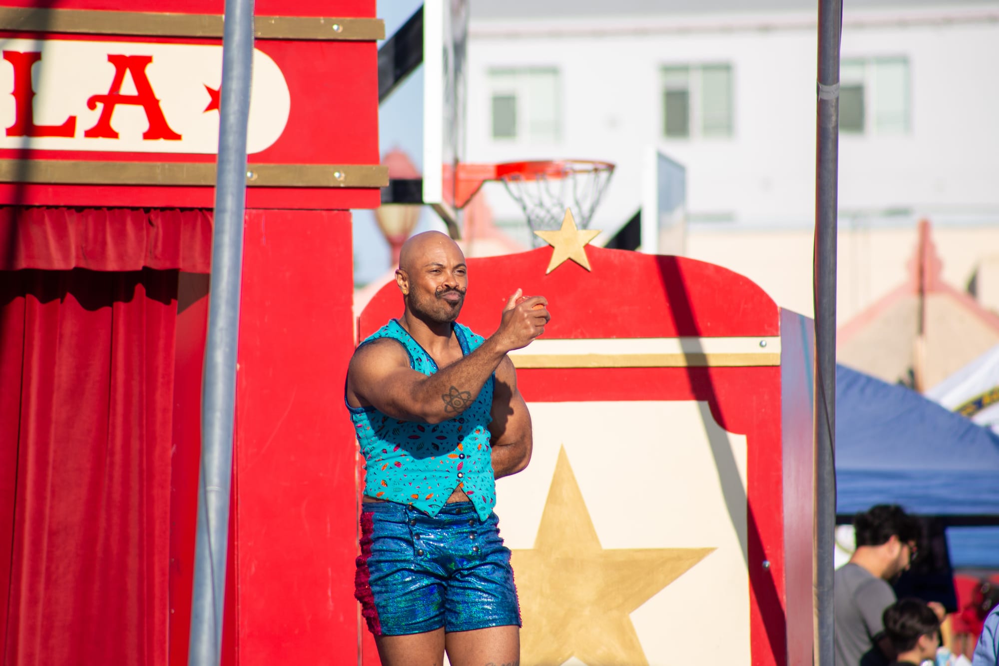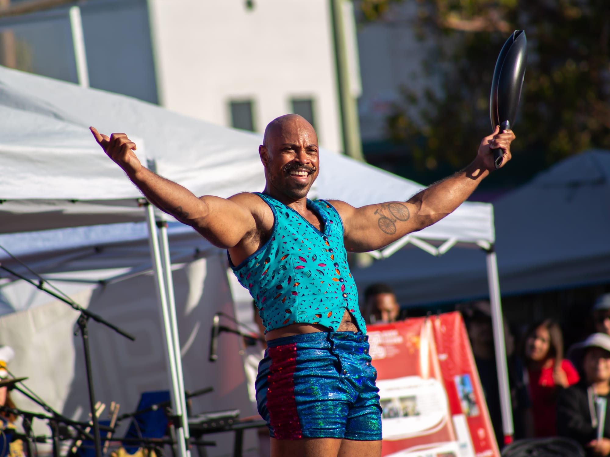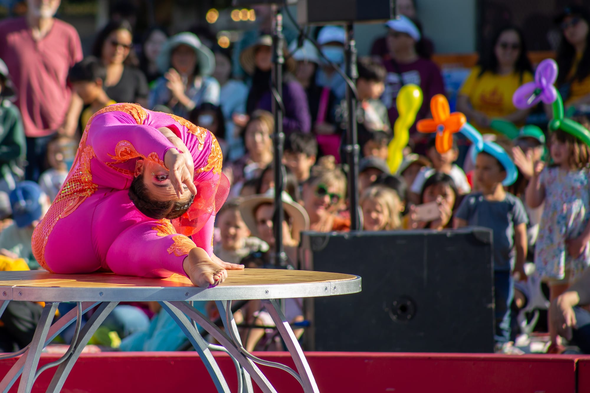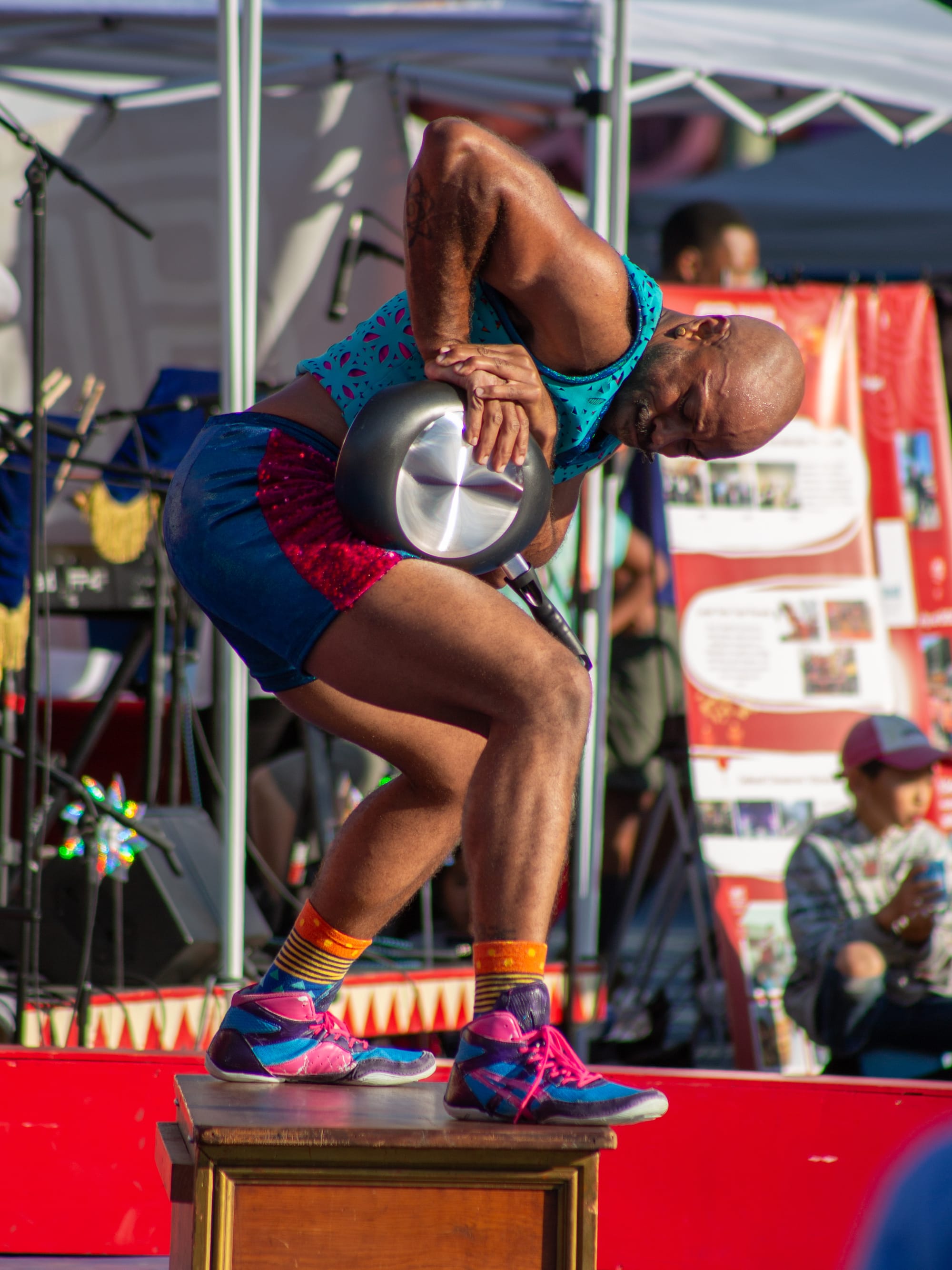 On this evening, as part of their summer series of free events in parks around the Bay Area, the company performed for an absolutely packed audience in Chinatown’s Lincoln Square Park. Attendees of every age stood, sat, and perched from the highest places they’d be held, for an hour-long show of colors, sequins, goofiness, and giggles.