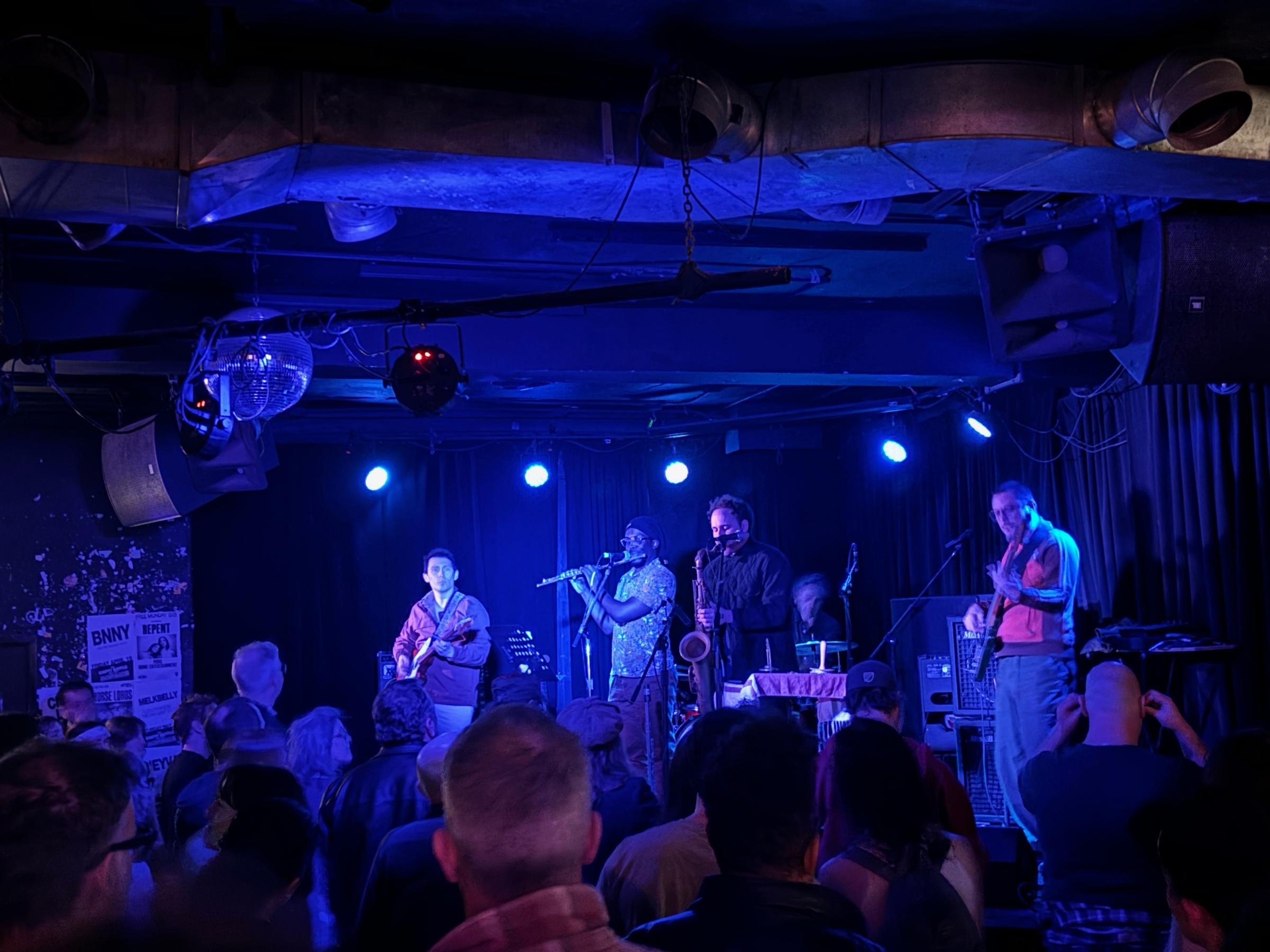 Starting the evening was Radio Outernational — drummer Areif Sless-Kitain and bassist Wayne Montana, along with guitarist Aaron Shapiro, flutist-saxophonist Hunter Diamond, and flutist Kenthaney Redmond, who’s replaced founding member Nate Lepine. The band was “Chicago energy at its finest,” as Sadier mentioned later in the evening. Starting their evening with an Ethiopian groove that felt like a track from the 31st volume of Ethiopiques, the five-piece traversed the global south for the rest of the set, bringing funk and Afrobeat to the fore with flute, saxophone, and rhythmic guitar offset by an absolutely dominant bass.