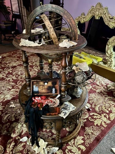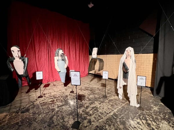 After the introduction, the escape room–like portion of the evening began. First, we were taken to the relic room inside the theater’s main stage area, where we found a range of creepy objects with clues about the murder — including a huge eye hovering from the stage. One corner had a setting of old furniture; another featured a video from Willamons explaining the relics, near a decapitated, kneeling dummy in Evangelista’s grim murder pose. Most distinctive was a set of five hanging papier-mâché figures, which represented Evangelista’s celestial gods.