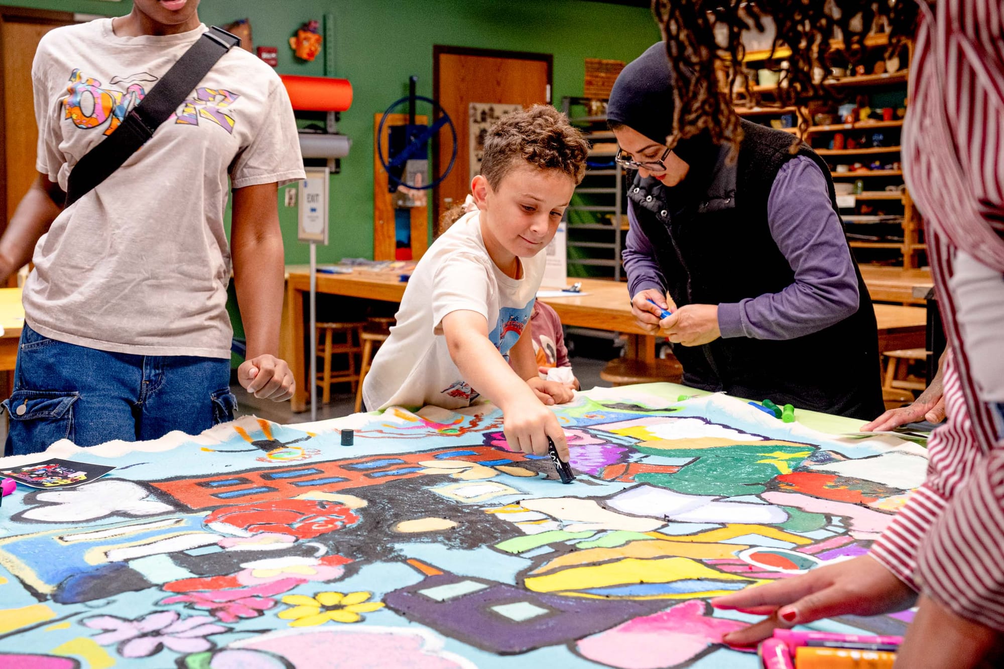 Painter and muralist Oshun Williams hosted a community workshop at the Detroit Institute of Arts (DIA), inviting participants to collaborate on a large-scale canvas that will soon be displayed in the museum. Part of an ongoing series in the DIA’s Art-Making Studio, these workshops center on collaborative mural-making, giving community members the chance to see their own work embedded within the museum's walls.
