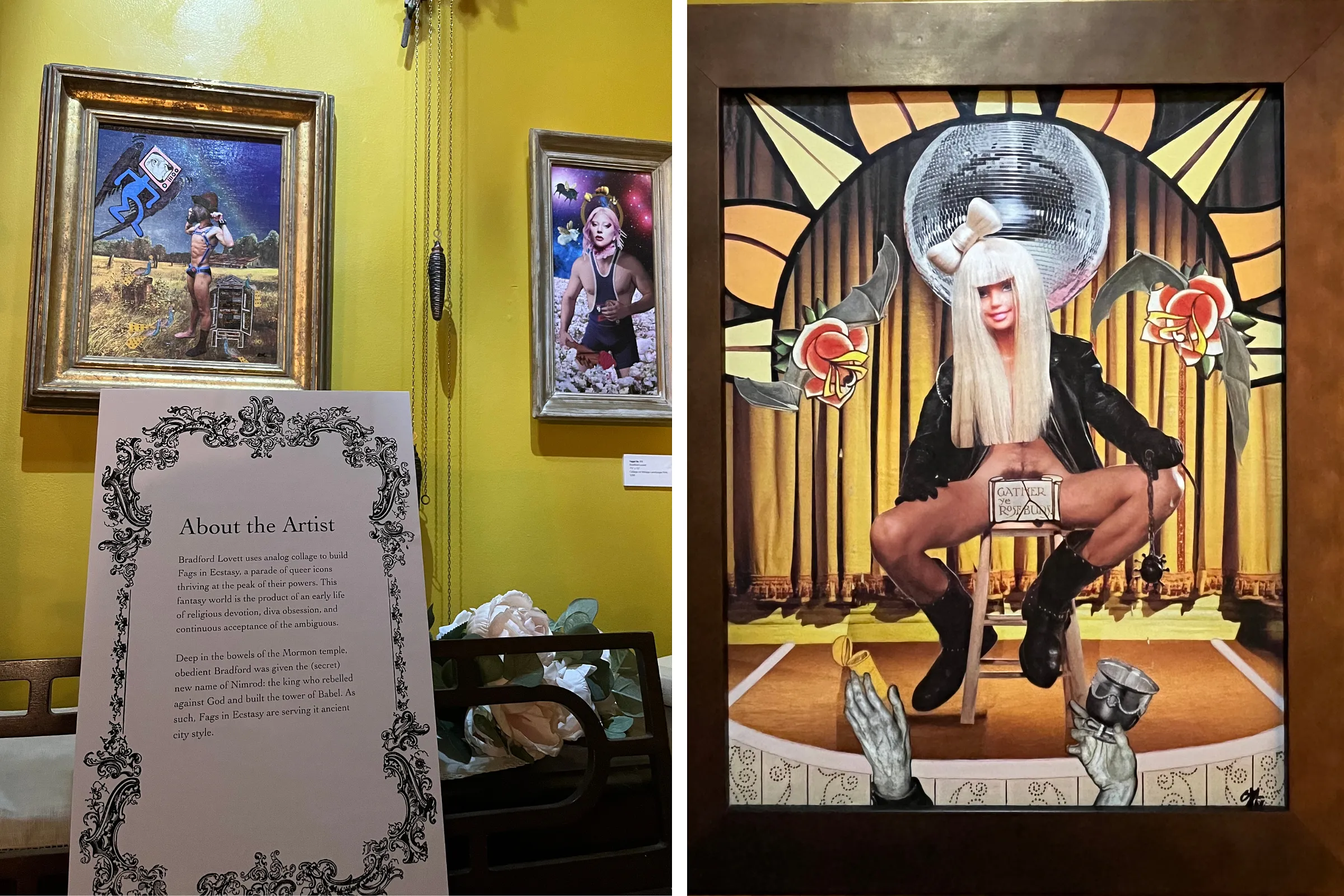 These forms — felled, flirty, familiar, fantastical — are meticulously hand-cut and collaged by Lovett out of his vast collection of magazines, (porno)graphic ephemera and old Mormon art. (Originally from West Texas, he grew up in the Mormon church and spent time in Tulsa and Washington, D.C., before returning here recently.) The oil painting that’s the backdrop for this scene was a gift from a friend whose grandmother — “no friend to the queers,” said the friend — painted it. Lovett accepted the canvas as a challenge, queering this bucolic space with a population that includes both frolicsome fun and the real stuff of transformation. “I only use what I can find,” Lovett told me. “That’s part of the challenge.”
