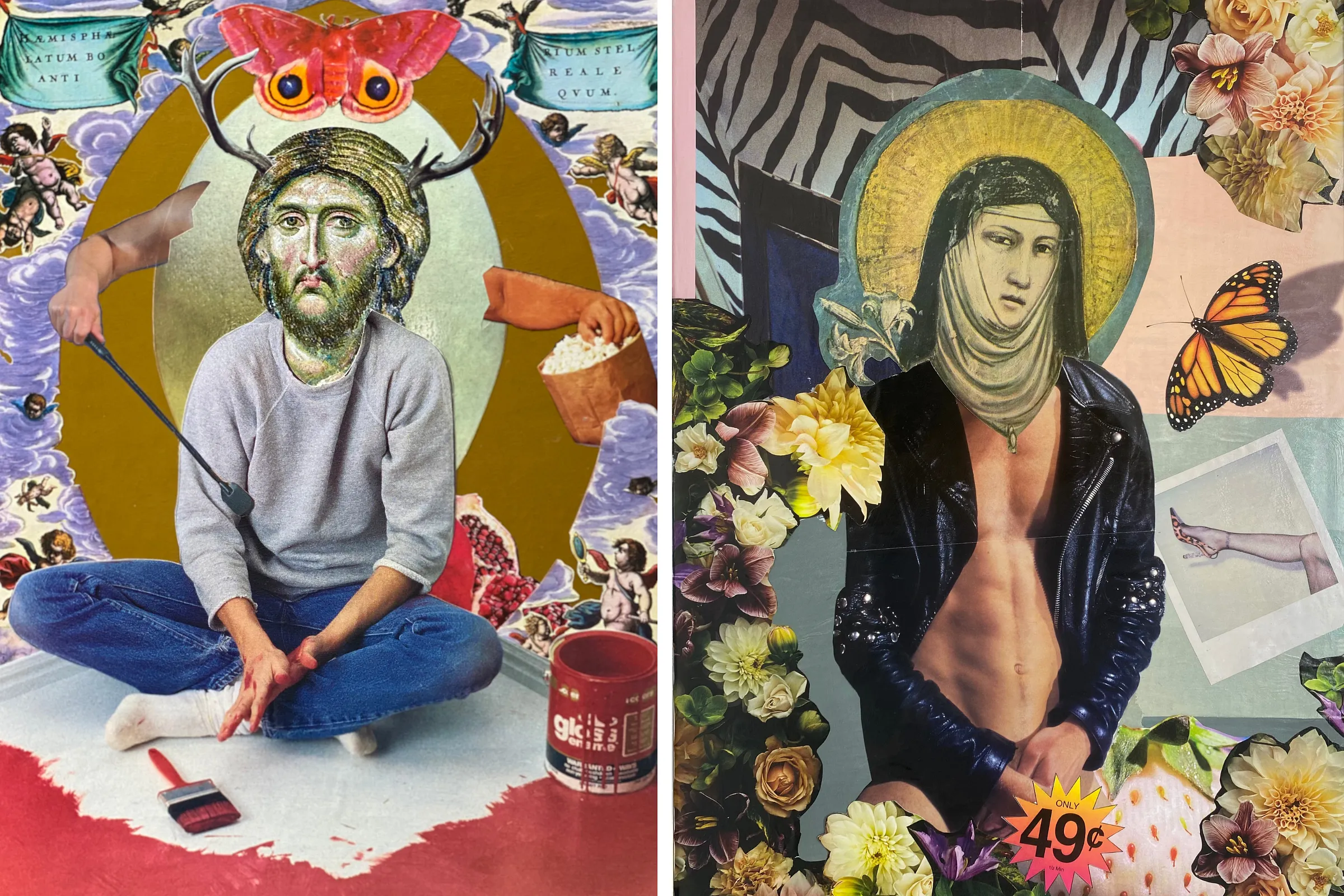 Almost a decade ago in Hyperallergic, Zachary Small argued that collage is “a quintessentially queer art form,” marked by “the construction of new worlds and identities.” Lovett’s work — diligently unearthing, untethering, aerating, playing, rearranging — gives a kaleidoscopic resurrection to these figures. “This fantasy world is the product of an early life of religious devotion, diva obsession, and continuous acceptance of the ambiguous,” Lovett’s statement explained. I’m still obsessed with his tattooed, bearded saint in blue pasties and pumps, his 49-cent Madonna, and his combat-booted Barbie with “naughty drips” (Lovett’s words) coming out of rosebuds on either side. But it’s that last item — continuous acceptance of the ambiguous — that resonates most deeply after spending time with his work.
