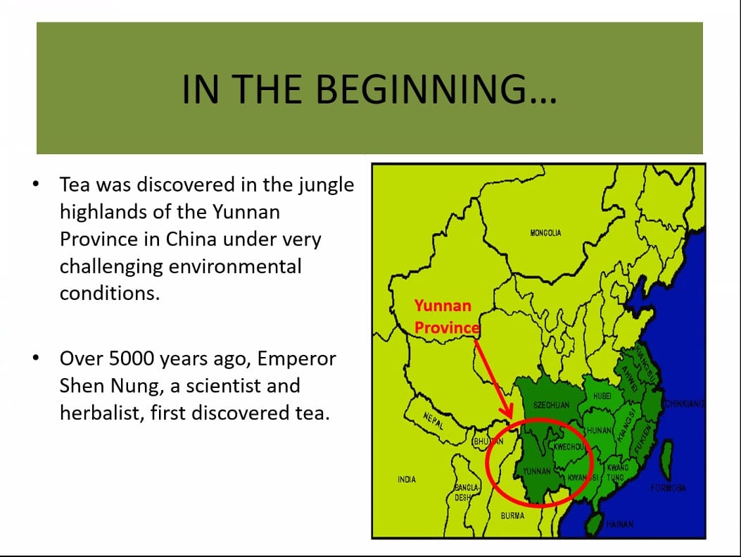 Beaudette shared the legend of the discovery of tea, which states that the mythical Chinese ruler Shennong was traveling through Yunnan province. He stopped to boil some water, and while the water boiled, some leaves fell into it. He enjoyed the aroma, and after sipping the concoction he received a jolt of energy from the tea’s caffeine. He ordered his entourage to start harvesting tea on the spot.
