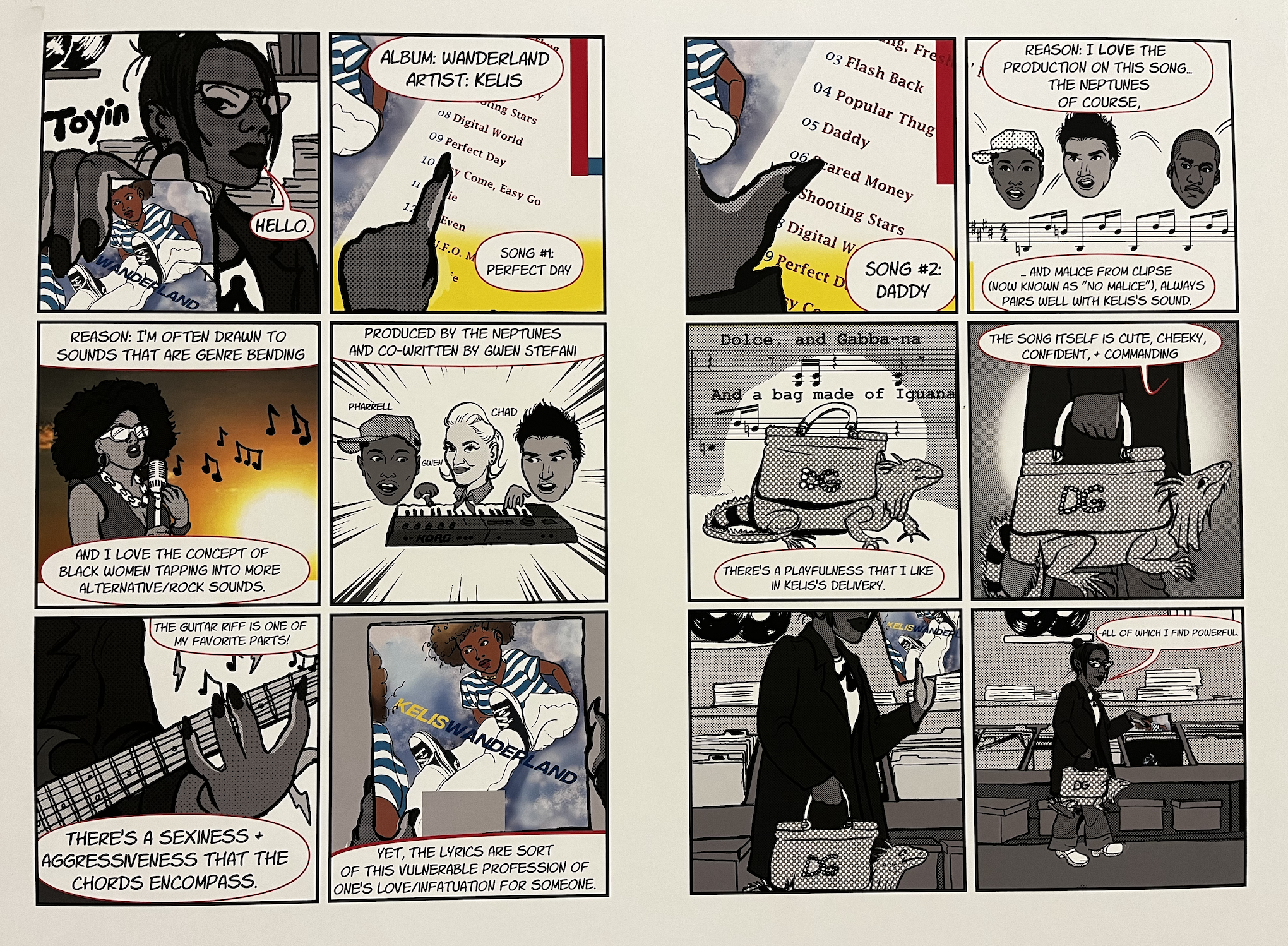 Look, for example, at Kelechi Azuakoemu’s evaluation-in-panels of her favorite album, Wanderland. She walks us through each song on the CD, bringing its sound alive through one dimensional motion. Is that not magic? She spells out the “sexiness and aggressiveness that the chords encompass,” through her depictions of acrylic nails holding down guitar riffs. A mass-distributed album becomes a personal story, and comics once again save the broader industry of art from the claws of co-optation.