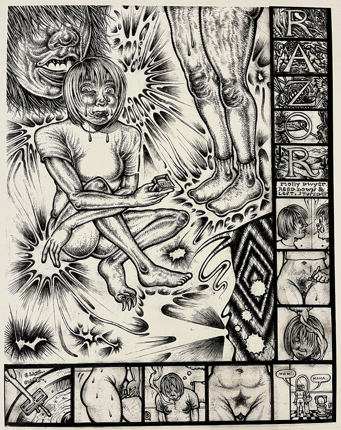 I was looking at a cartoon (self?) portrait of pee by Andrew Jefferey Wright. It’s currently on display at Drexel’s Pearlstein Art Gallery for the exhibit “Philly Comics Now: The Art of Graphic Storytelling,” curated by underground comic shops Partners and Son.