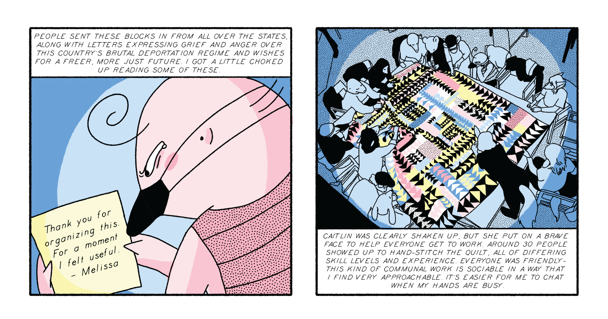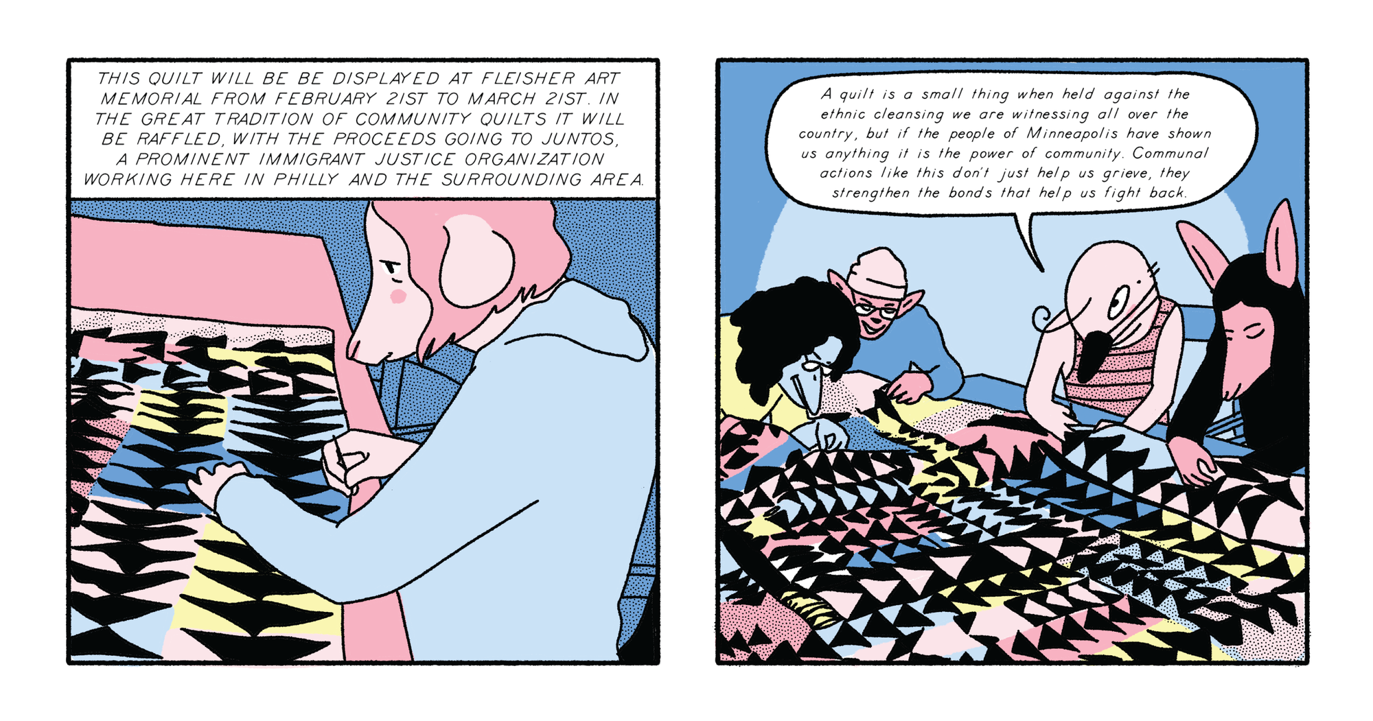 Izzy True returns to Parkway Central Library, this time to sew patchwork protesting immigration crackdowns.