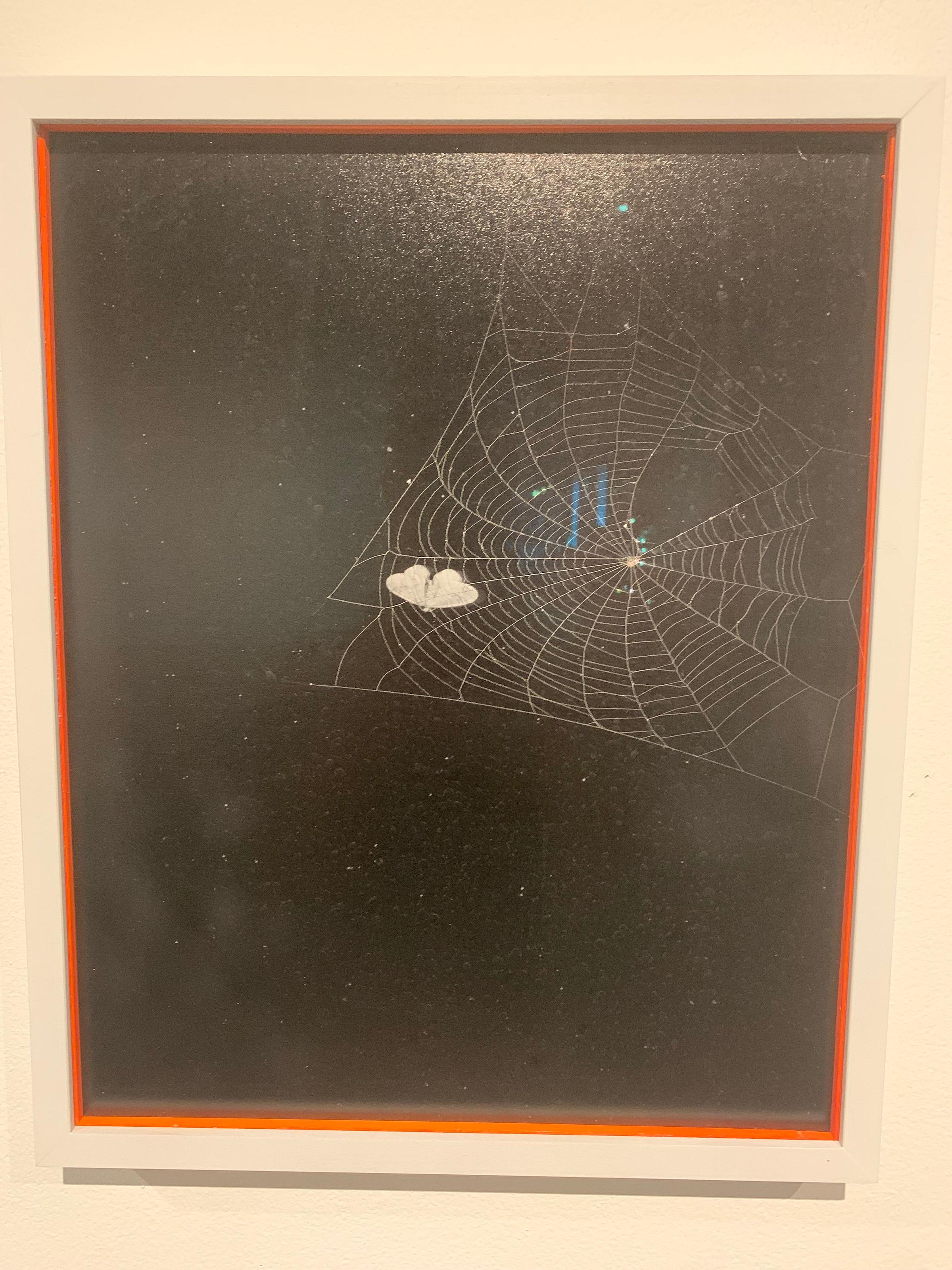 Next I viewed “a week of the same moth on my window,” a series of seven pieces which feature the changing positions of a white moth and white spiderwebs on a black canvas. The intricate patterns of the webs seem to grow more disordered as the paintings progress.