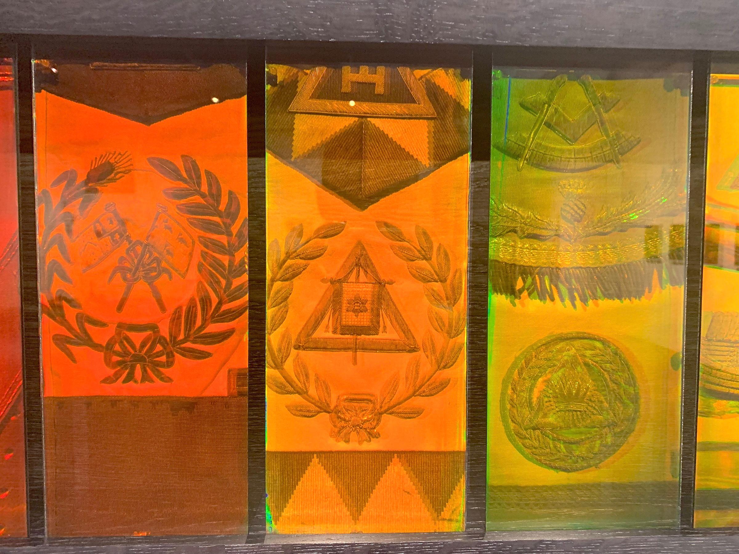 The first piece I encountered was “Freemason Rainbow” (pictured above) by Matthew Schreiber. It consists of 20 holographic panels which show depictions of Masonic imagery. Each hologram is colored a shade of the rainbow, transitioning from red to violet.