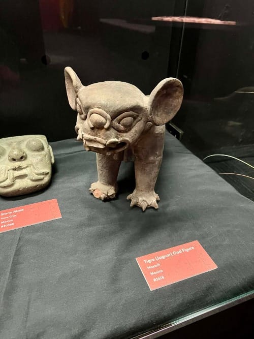 The exhibit opens with a display of Mesoamerican artifacts from Cranbrook’s permanent collection, like ceremonial masks and figures, including an adorable jaguar deity figure that looked almost exactly like Stitch from “Lilo & Stitch.” It includes games similar to those played during Mayan times including patolli, which is like Sorry! or Parcheesi, and a small nerf version of pok-ta-pok. The latter was a ceremonial game I had found particularly fascinating during my trip to Mexico; it was nice to learn about it again and see what it might have looked like in the accompanying video.