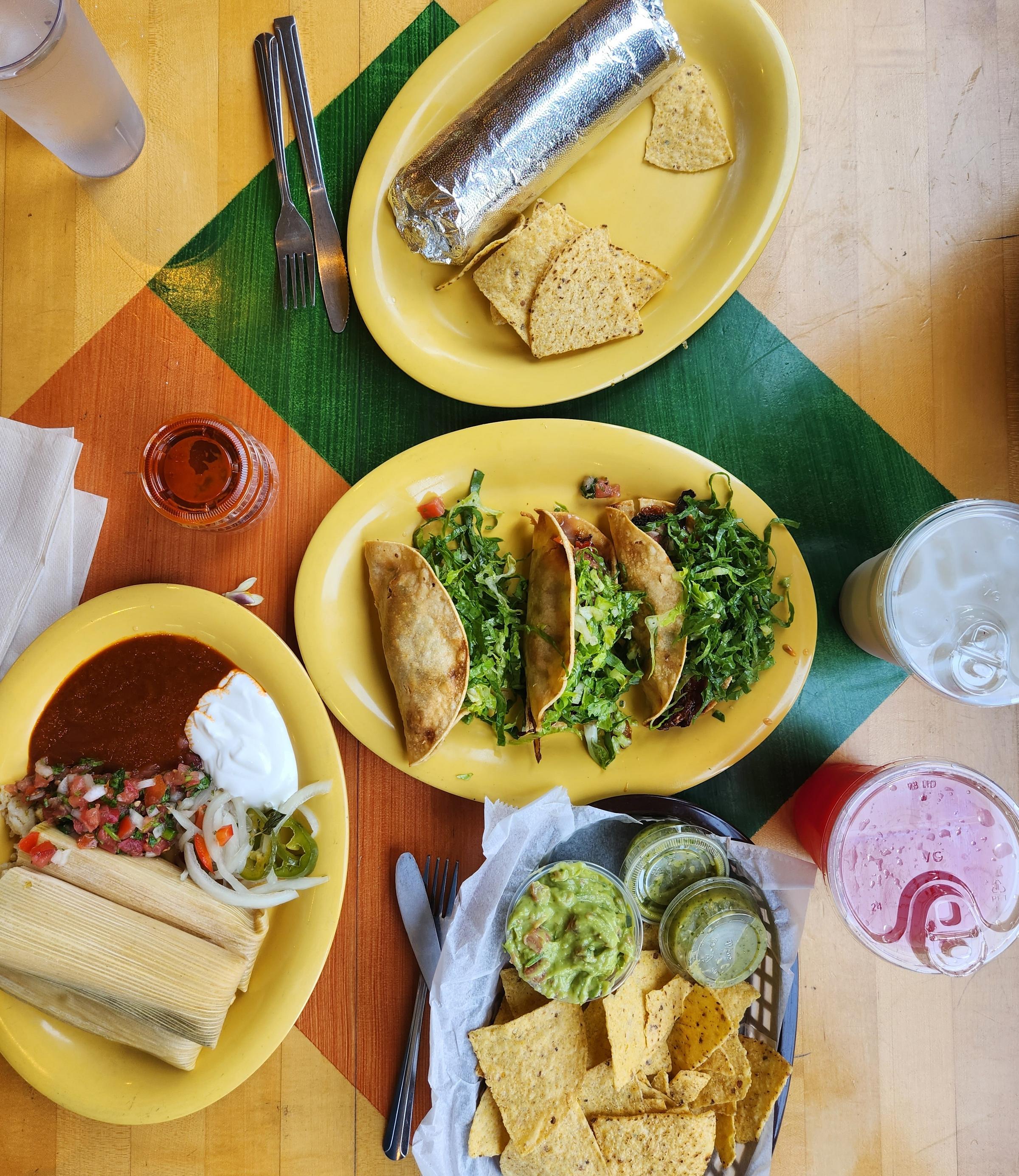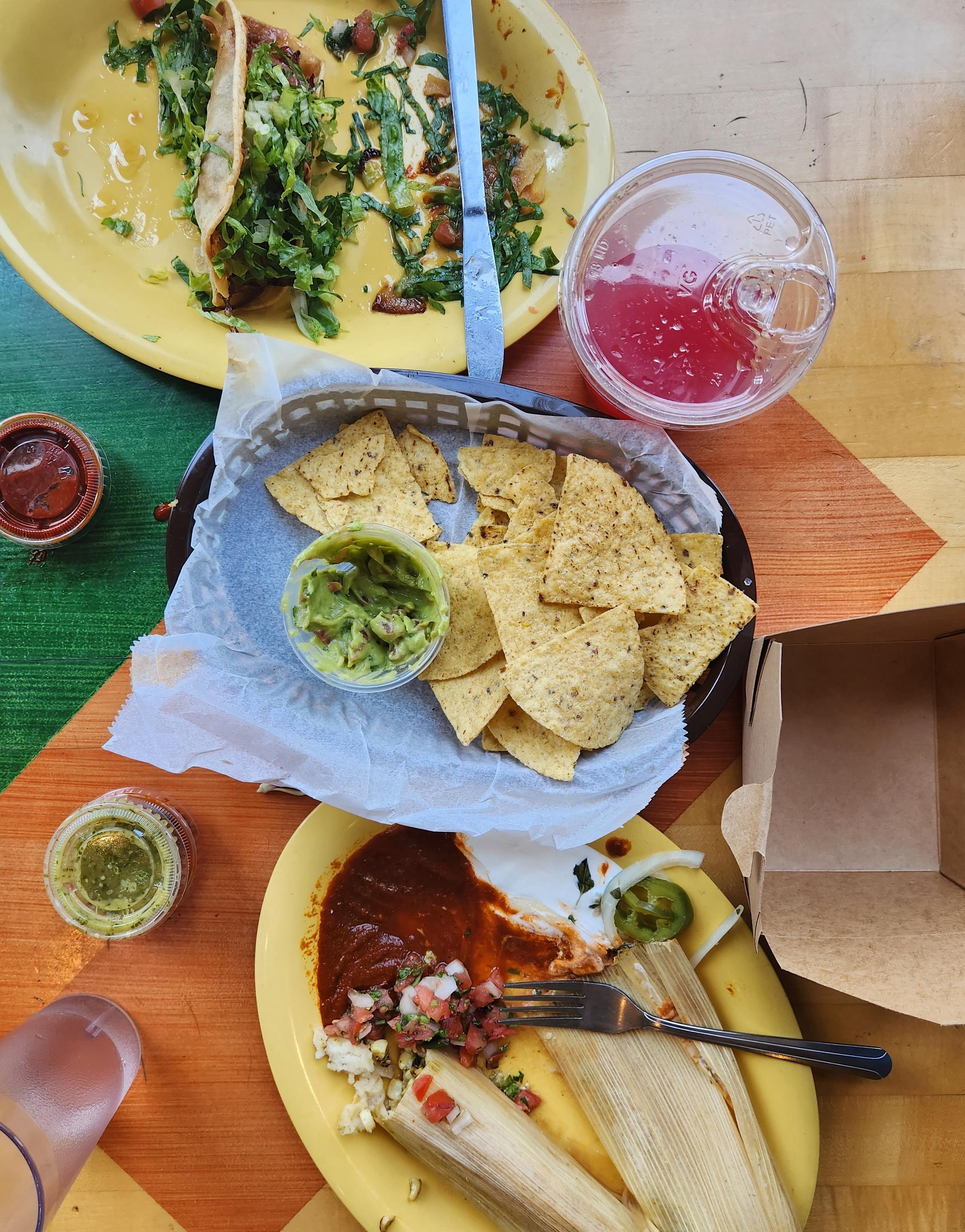 The eatery boasts a medium-sized menu in medium-sized font on the wall leading to the register; I was a bit overwhelmed with decision making. That said, the aforementioned crispy tacos were a no-brainer, and my friend Emily’s go-to there is a bean and cheese burrito, so to round out our tasting sampler we added guacamole with house made chips and a special of corn tamales, because how could we not.