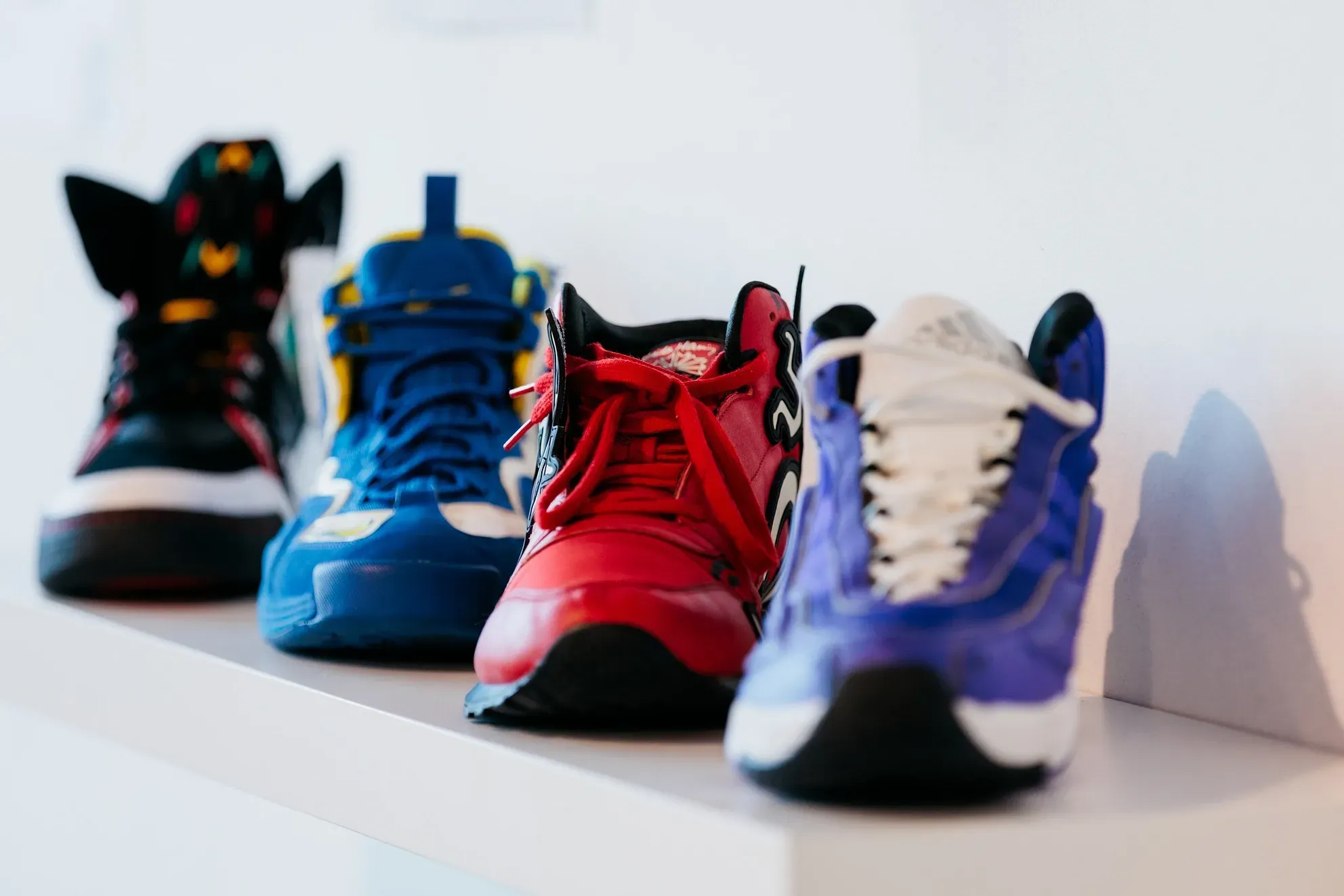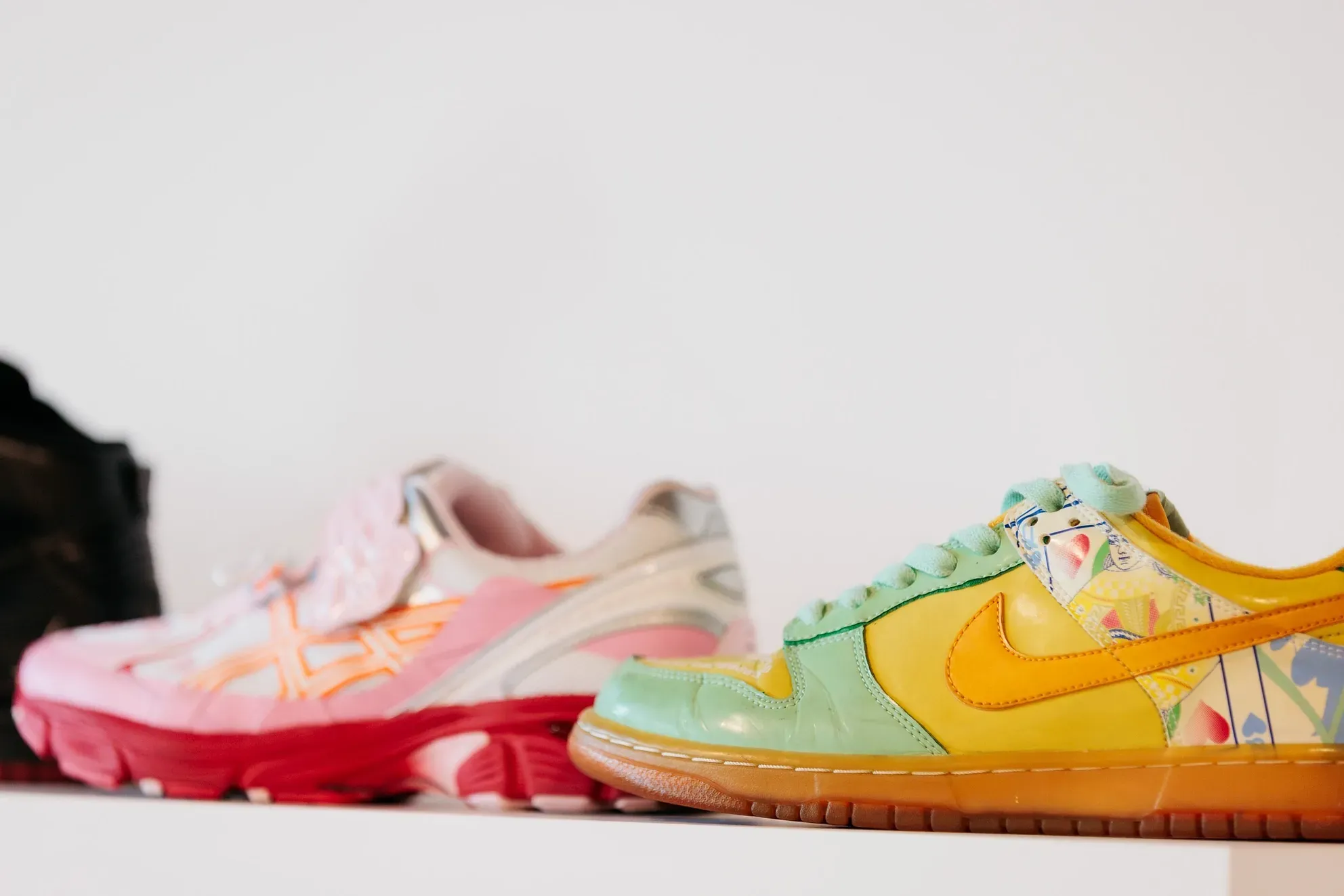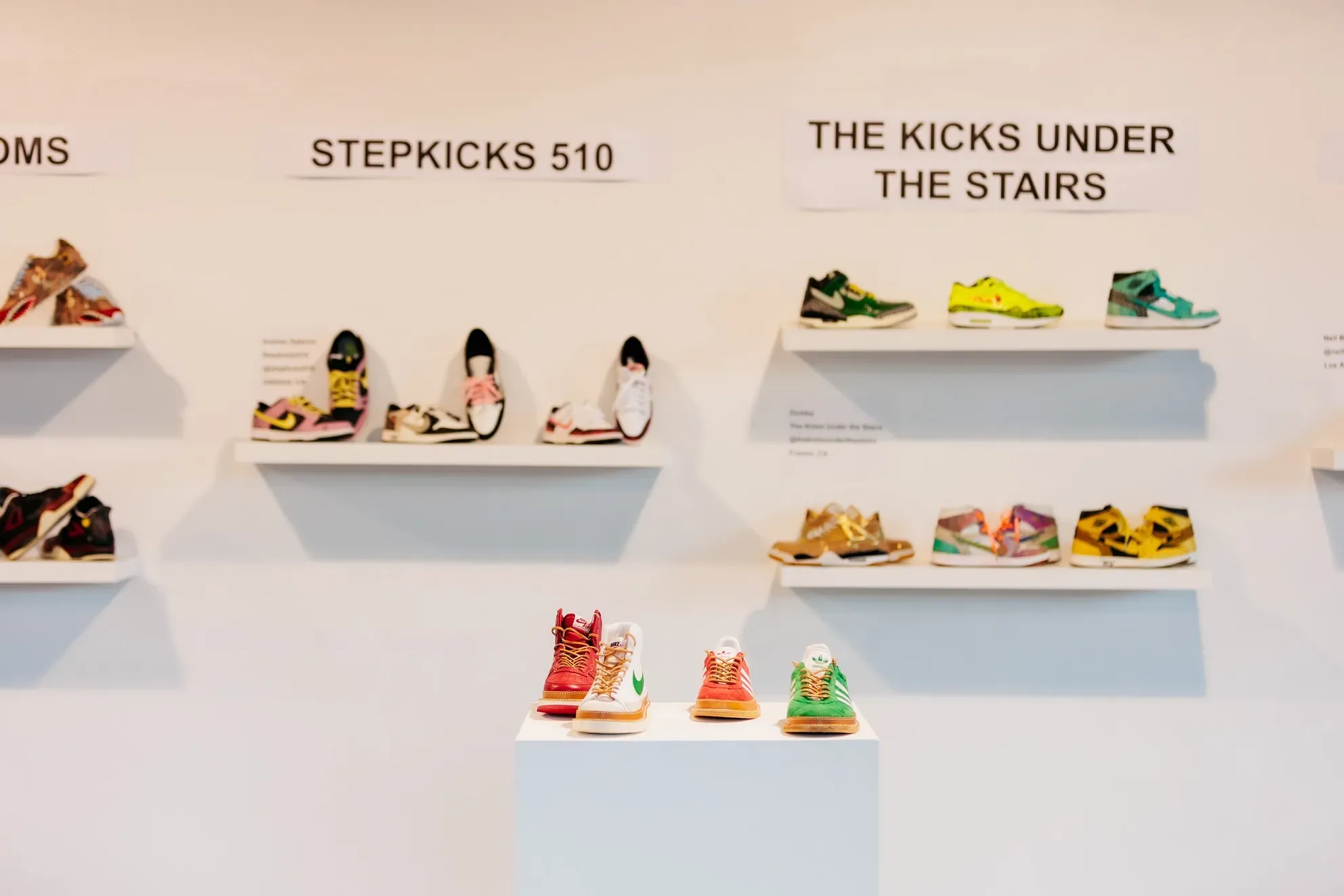 A rare collection owned by Sneaker Museum Oakland sat on a shelf in the back, with vintage Michael Jordan posters, made in collaboration with Spike Lee, adorning the walls. Other artists featured included Cobbler Bushwick, Jar Customs, Jeremy Novy, Joshua Mays, Katt Davis, Malik Byers, Neil B. Caro, Sirron Norris, Stepkicks510, Scratch Customs, Tite Customs and Worthy Foe, and despite being a male dominated industry, many female designers, including all shown here, were featured.