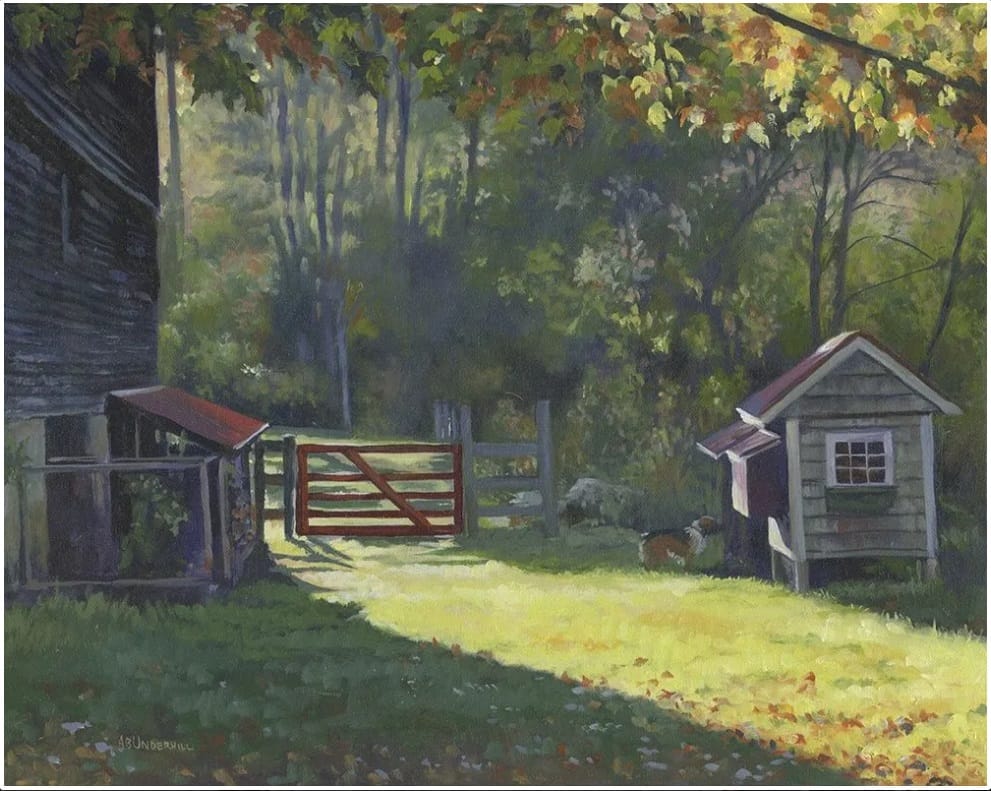 The theme of the exhibit is “exploring the change of seasons.” It’s easy to see that exemplified in the painting that took first place, titled Morning Rounds by Alecia Underhill. While the majority of the painting seems to depict an idyllic summer day with a cute dog relaxing in the cool shade, the foreground reveals the first inklings of fall, with leaves in the tree taking on the auburn, golden and brown hues of autumn. They are also sprinkled lightly on the earth too. Underhill’s work embodies change more so than any other work in the exhibit, capturing the transition from one season to the next with important, yet understated details.