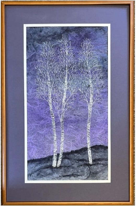 In second place is Aline Hoffman’s piece, November Sky. Hoffman’s depiction of birches stretching up into an amethyst sky is almost skeletal, as if the trees are trying to reach through the veil. In this work, Hoffman depicts the change of seasons in a metaphorical sense, as the depth of the November sky signifies the transition to the lifelessness and solitude of winter. The artist’s use of gouache, in addition to traditional watercolor, gives the image an opaqueness that adds to the weight of the work and the finality of the move into the long nights of wintertime.