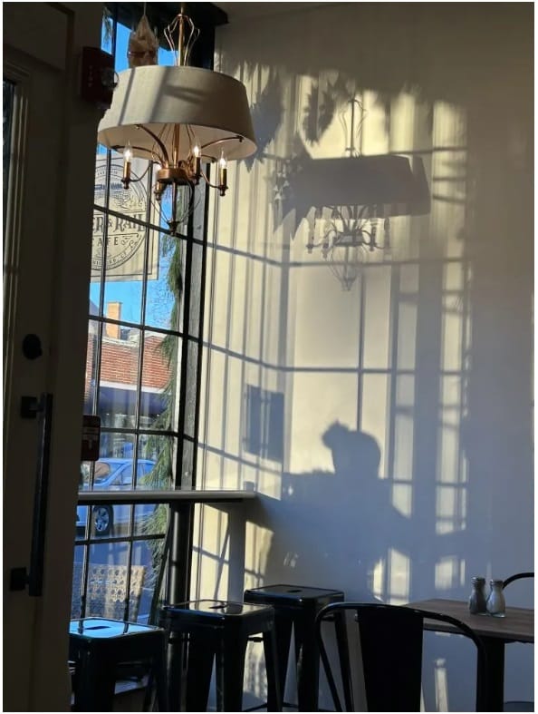 The third place artwork changes genres, shifting to digital photography. Spirit of the Holidays by Elizabeth Losacco Massa uses the eponymous cycles of light to represent change. In the foreground of the image is a pendant light with multiple candle-shaped bulbs adorning the intricate, hourglass-shaped centerpiece. But the real focus of the photo are the shadows on the far wall, contrasted against the golden light. The elongated silhouette of the figure, fur from the hood of their winter coat as visible as the bun atop their head, is the telltale sign of a late autumn afternoon. The lengthening shadows correspond with the lengthening evening, and even the combined might of natural and manmade light can’t prevent the night from coming.