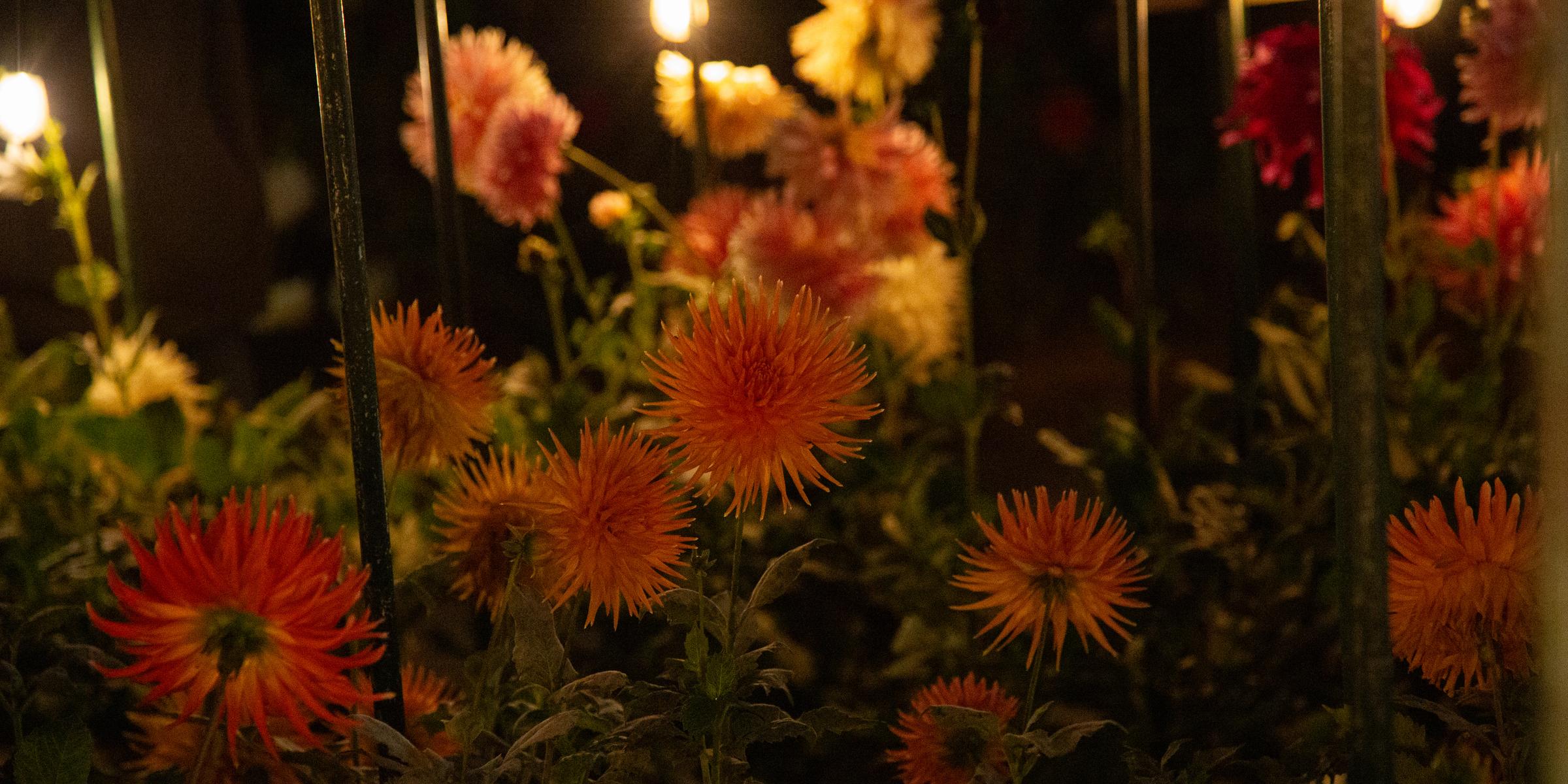 Tired and achy but having seen perhaps half or two-thirds of the works on display, I was walking towards the exit when I was waylaid by a patch of dahlias. One lay face down, on the ground, drooped but untrammeled. The remainder stood tall, proud, and bright in a dark evening.