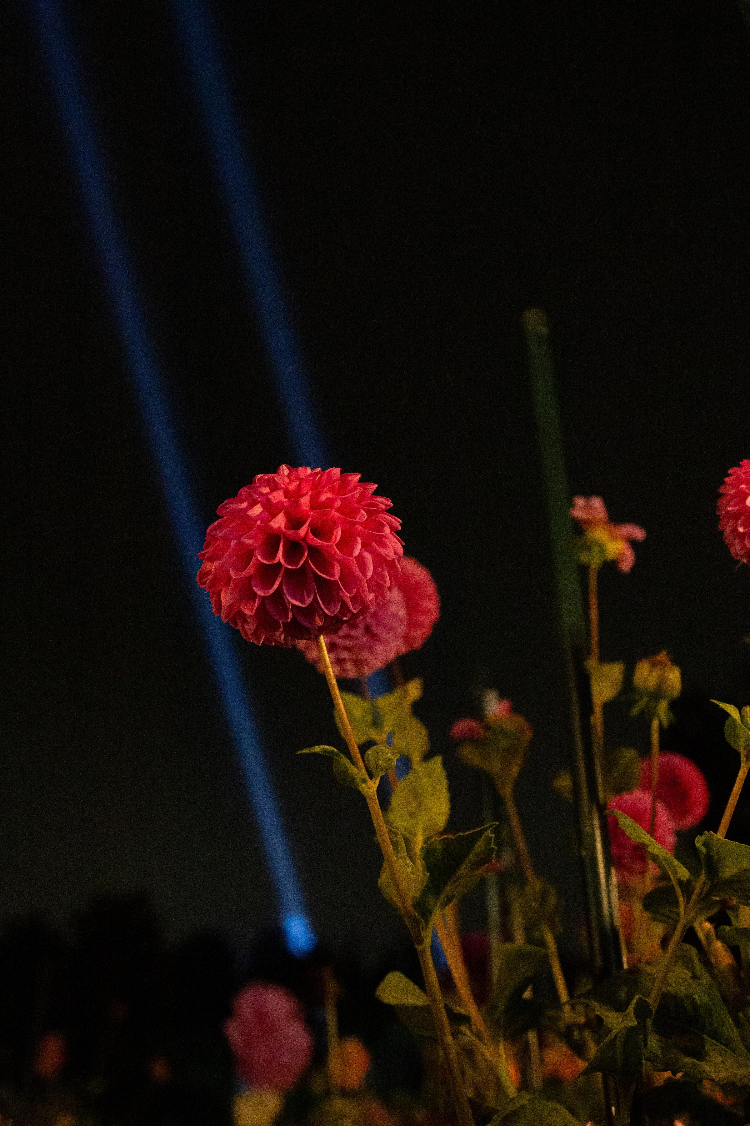 Maintained by the San Leandro Dahlia Society, it was densely planted with the small bushes and truly striking. Half a dozen or more colors and varieties, ranging from small and close-petaled, rounded and pom-pom-esque to huge, hand-sized and explosive, curling and twirling petals reaching for the night sky and the spotlights overhead. I spent nearly 20 minutes with them, crouched and cooing, photographing in the low light, doing my back not one favor. But for my brain and lenses, both ocular and mechanical, the discomfort is easily displaced by the images and memory of those burning orbs and their perfectly rounded cousins and their silk ribbons of flower flesh.