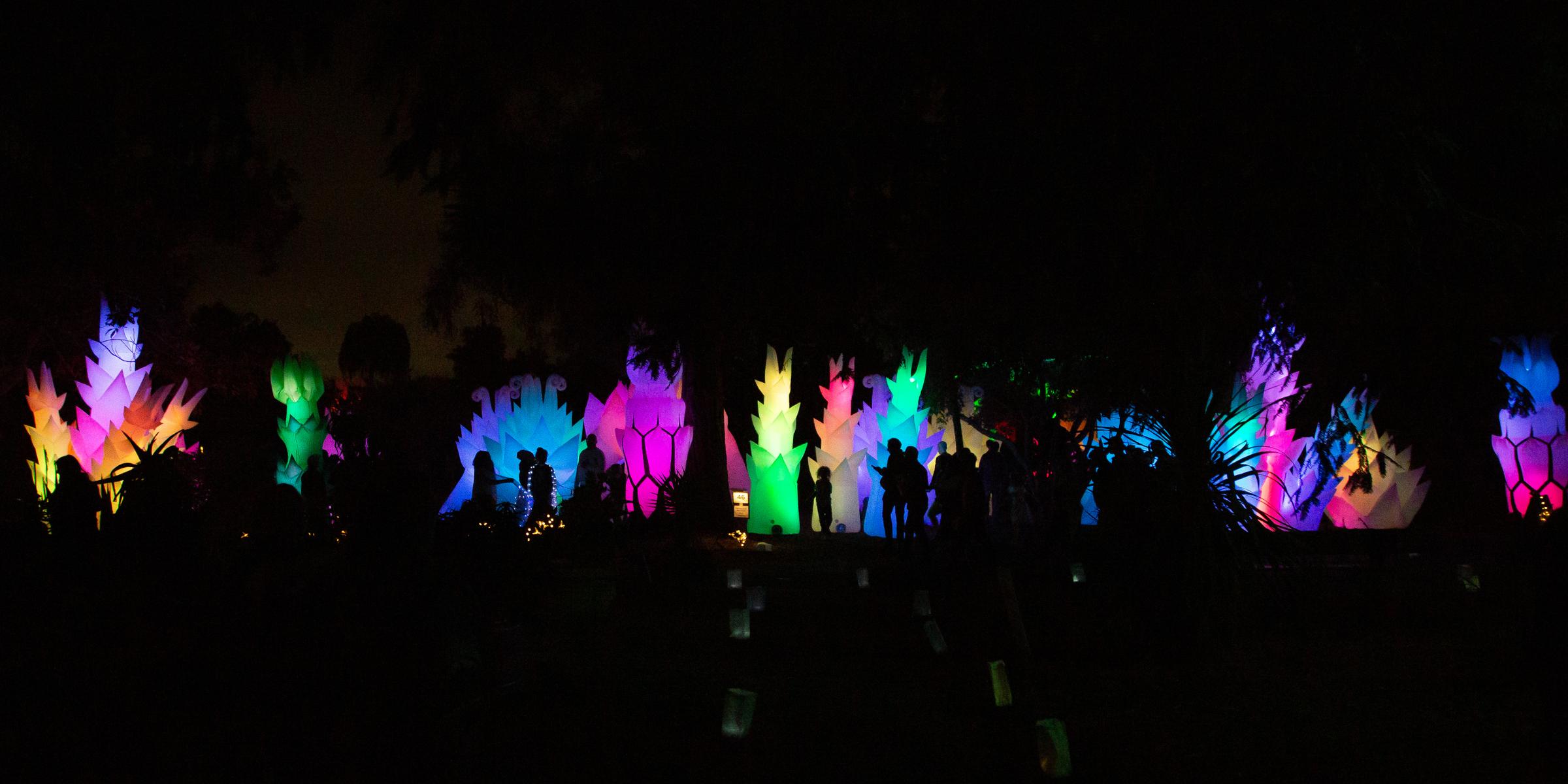 This was one of many pieces in the clearing-sized installation “SubQuercus” by artists Aimee Baldwin, Logan, and John Daniel, which in turn was a small part of an acres-wide swath of gardens at the edge of Lake Merritt in Oakland occupied by the 12th Annual Autumn Lights Festival last weekend. The event, a fundraiser for the themed Gardens at Lake Merritt, featured over 75 separate installations, ranging from the false-campfire-sized to a large lawn of glowing and pulsing inflatables.