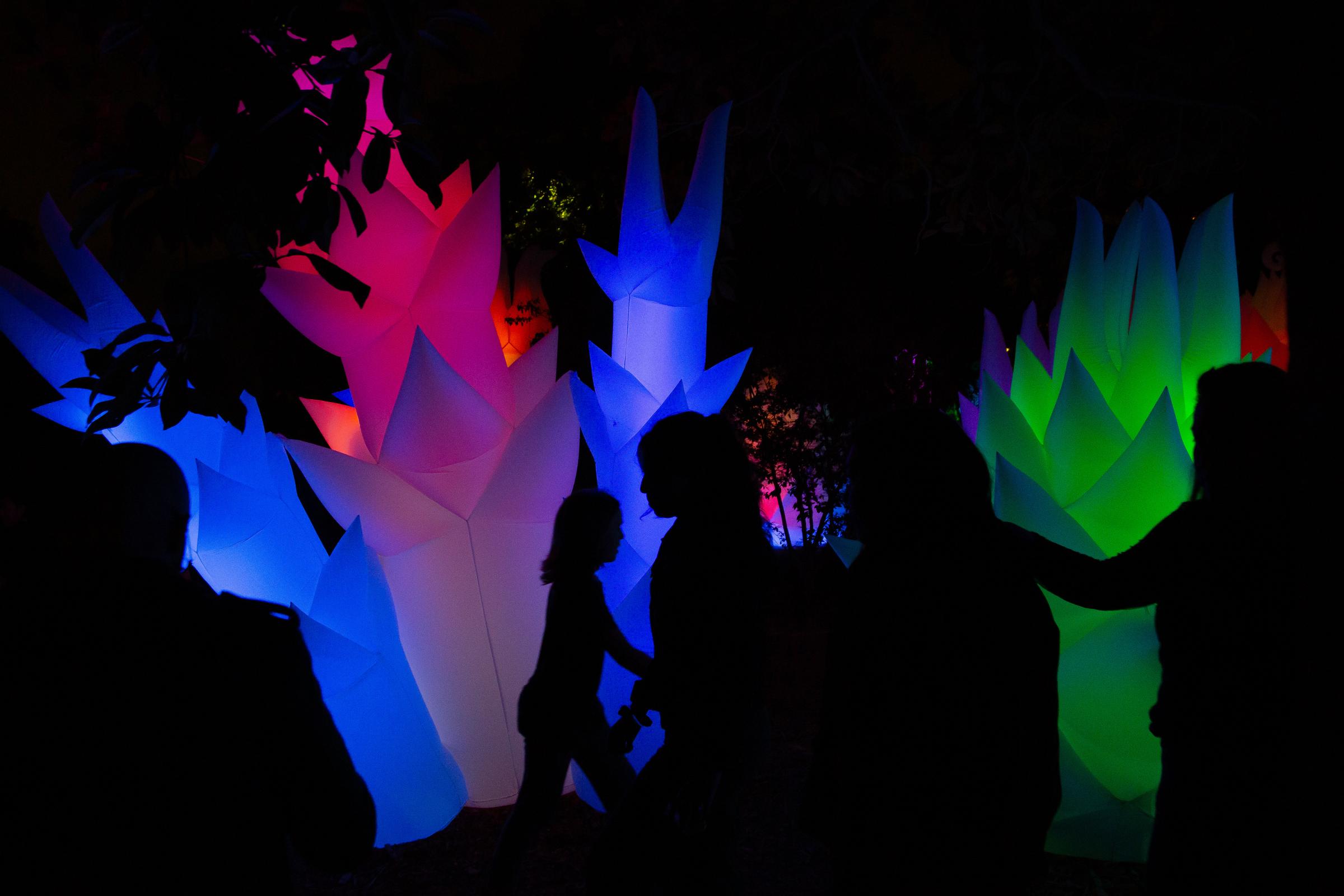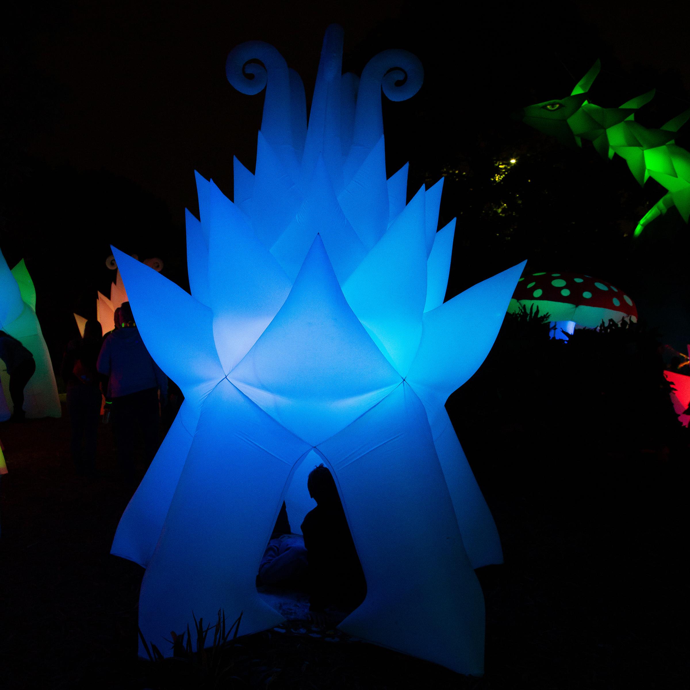 AstroBotanicals, by Stan Clark, are huge inflatables in vaguely-plant-like forms illuminated by slowly cycling color-changing lights, this night arranged on a large swath of lawn. Some of them piped soothing but upbeat music. They’re available to rent, and while I’m sure the pricetag is hefty the installation is transformative — spatially and personally. They encouraged interaction, though I struggled to do much touching myself.