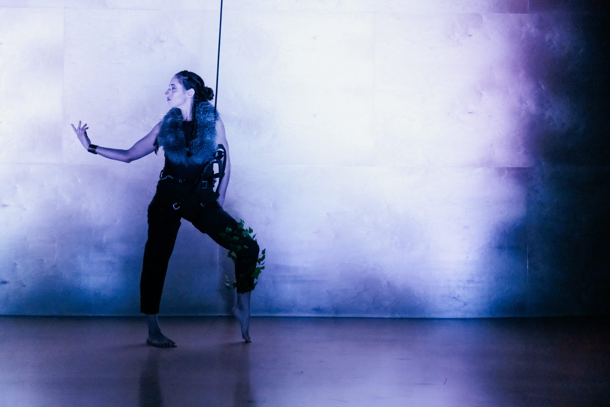 Next came Nature Boy by Annalise Ritter, a piece exuding power and vulnerability. Vine wrapped around one leg, Ritter stood before us, grounded and formidable, warrior-like, before scaling the wall to begin a series of rapid leaps and tumbles. She seemed at times to be in a fierce battle with herself; at others, the hero of her own narrative. Ritter's mastery of movement was incredible, leaving the audience breathless with her deft control and striking physicality.
