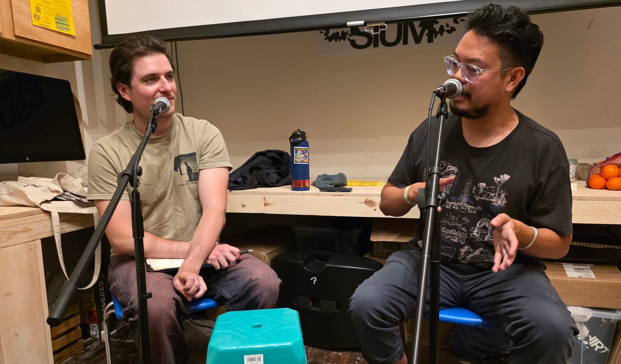 This contributor, in the company of fellow journalist Ken and several dozen other folk, dove into the Deep Listening session on Saturday evening. Seated on folding chairs between walls of books about art and psychic aspiration, we were guided by Kiril Bolotnikov, an Oakland writer, editor, and translator who hosts the eclectic music show Sonic Artifact on Psyched! Radio San Francisco, and fellow Oaklander Geoff Saba, a multi-instrumentalist, sound artist, recording engineer and producer with their own Itinerant Home Recording studio.
