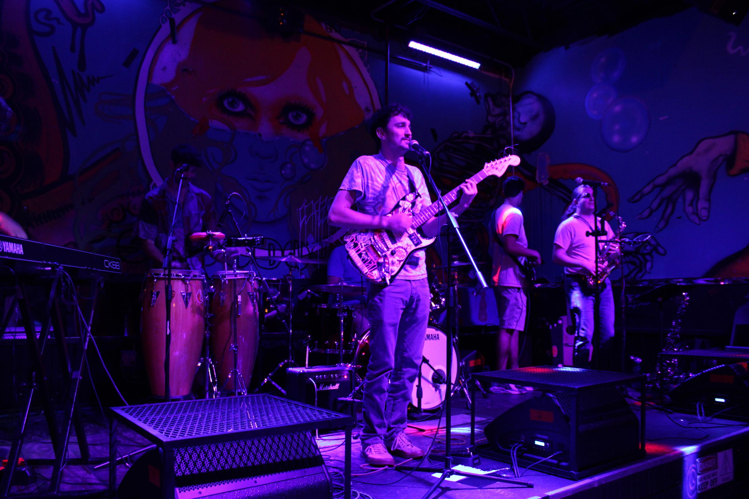 The show began with beloved local band Tom’s House, whose set of retro late-’70s/early-’80s prog rock jams was plagued by audio issues. The two vocalists struggled to be heard against the rest of the seven-piece ensemble. At one point, the lead singer/guitarist’s mic stopped working. “It’s okay!” he shouted pluckily. “I don’t need it!”