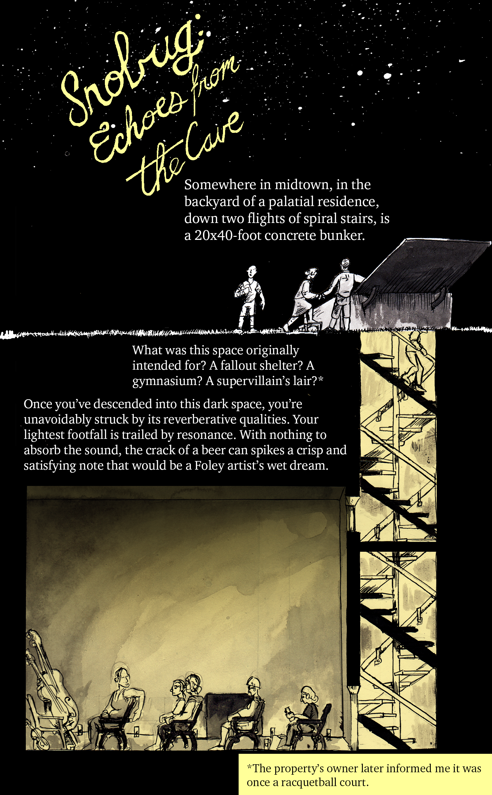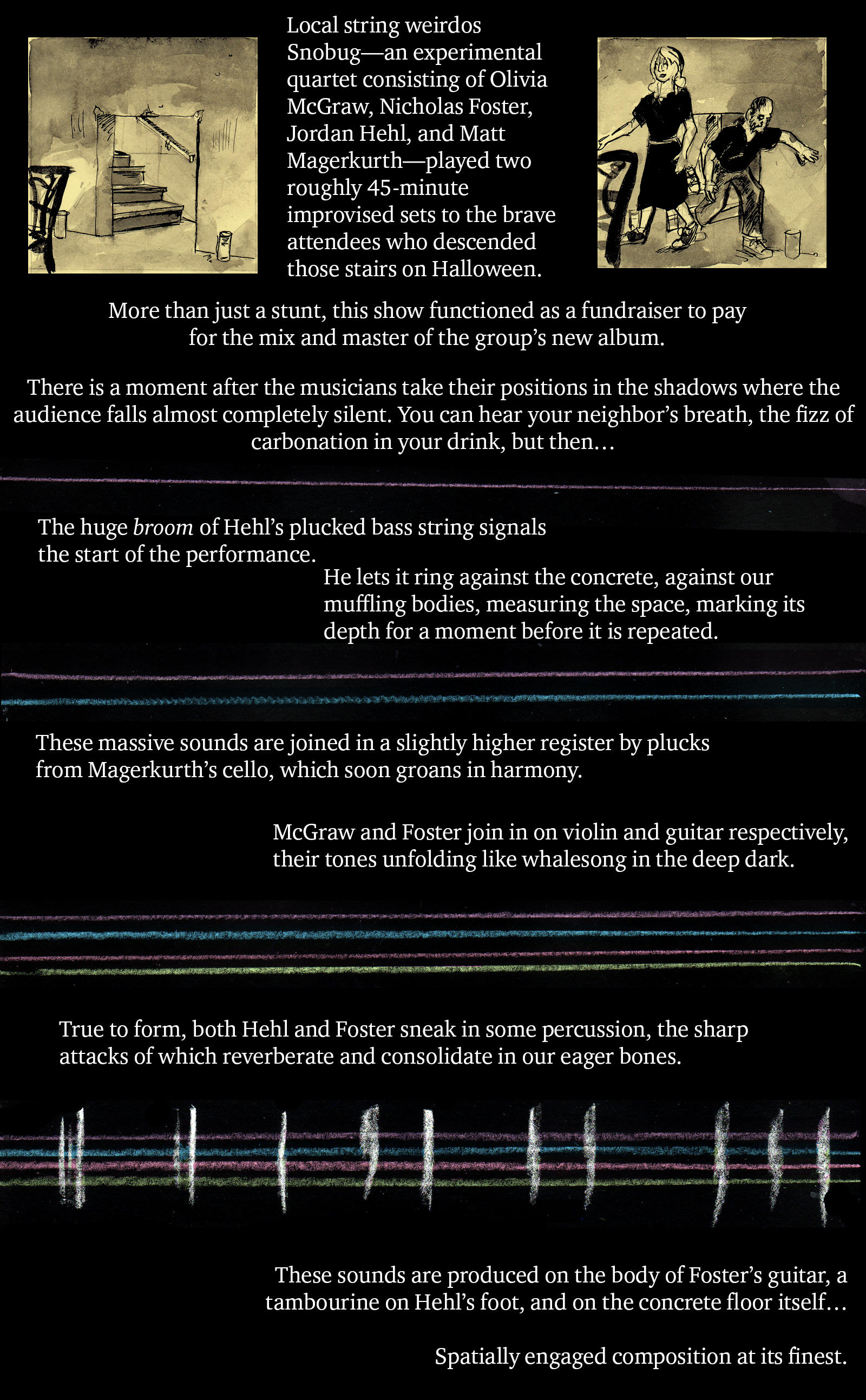 Tulsa Descend Into The Sonic Abyss In The Heart Of Midtown Tulsa Spatially engaged composition at its finest from local string weirdos Snobug. CARL ANTONOWICZ 14 Nov 2024 · 1 min read Snobug. Art by Carl Antonowicz. Snobug: Echoes From The CaveSecret location, midtown TulsaOctober 31, 2024