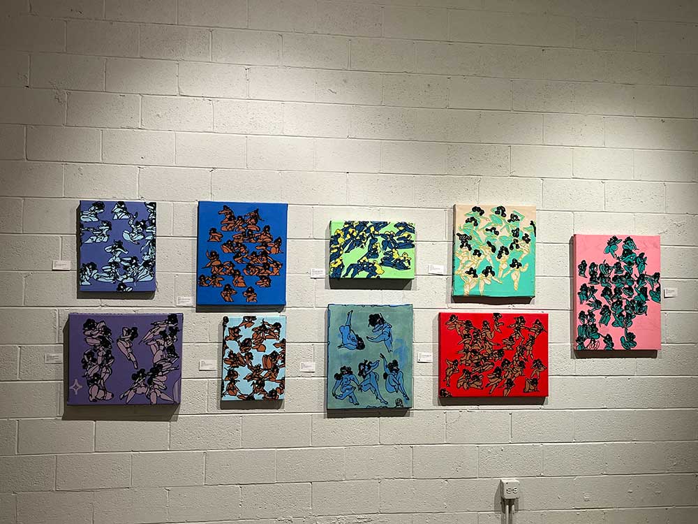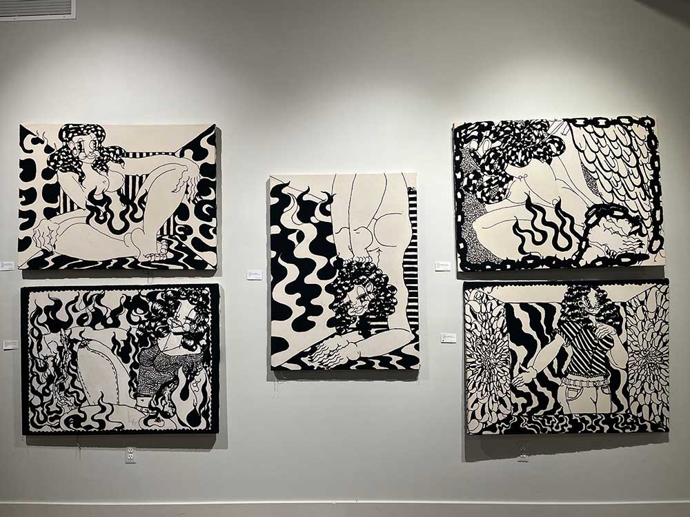 One wall features five stark black-and-white works — each largely centered on a single woman surrounded by flames, chains, or positioned in physically awkward poses. In one, the woman’s crotch area is on fire. In another, she’s flipped upside down, balanced on her forearms. While stripped of color, these pieces feel somehow even more alluring. The absence of hue amplifies the thread and theme of the exhibit overall, challenging the rest of the pieces in the space.