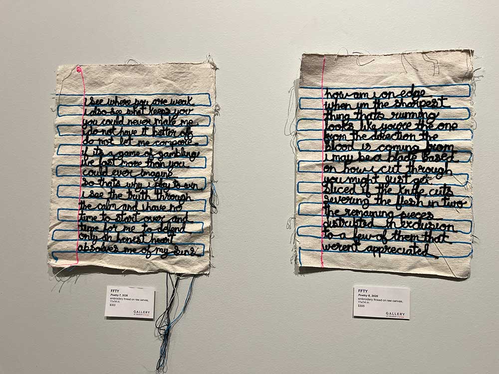Ffty’s use of embroidery amplifies the paintings, adding dimensionality that shifts depending on where you stand. You can trace a single line across a body and watch it evolve from light detail to dense contrast.