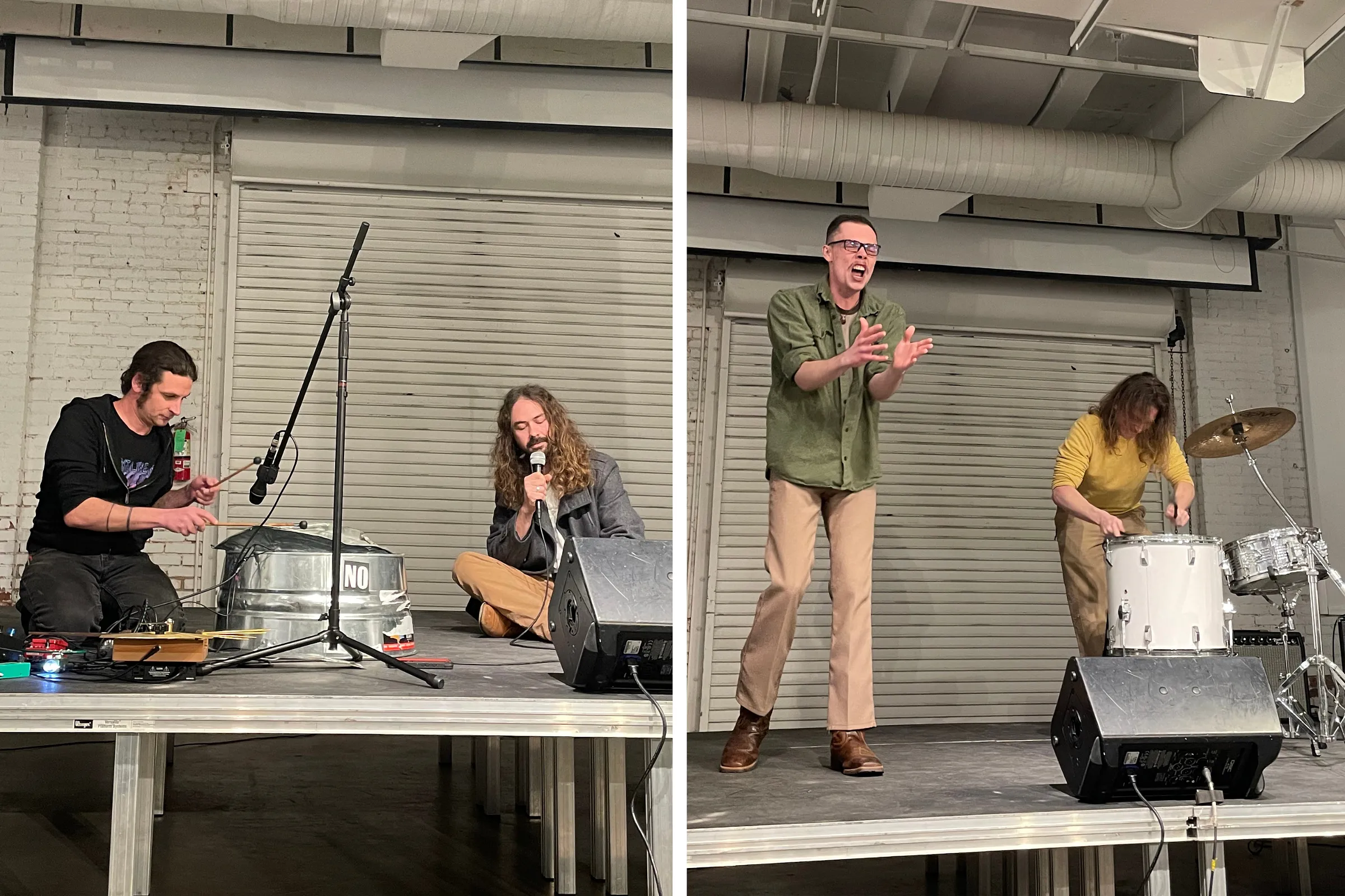 Enter John Paul Ratliff and Carl Antonowicz (handmade washtub-noise-sound thing). It was so fun to watch a merging of narrative lyricism (Ratliff is also a musician) and noise music. Antonowicz’s manipulating of screws, nails, and chains lent tension and a sense of place — a delightful surprise. Then Sean Phariss joined the Tulsa Review Crew’s own Zack Reeves on snare and cymbals. Both are musicians and writers and felt pretty locked in from the get-go. Reeves mentioned his first love was rhythm, which checks out. I caught myself smiling even during a particular somber moment in the poem because I was so impressed by how Reeves caught the beats and the shivers and the slaps of the verse. Phariss is also a comedian, a performer; he encouraged the audience “to be seen and heard” as much as the artists.