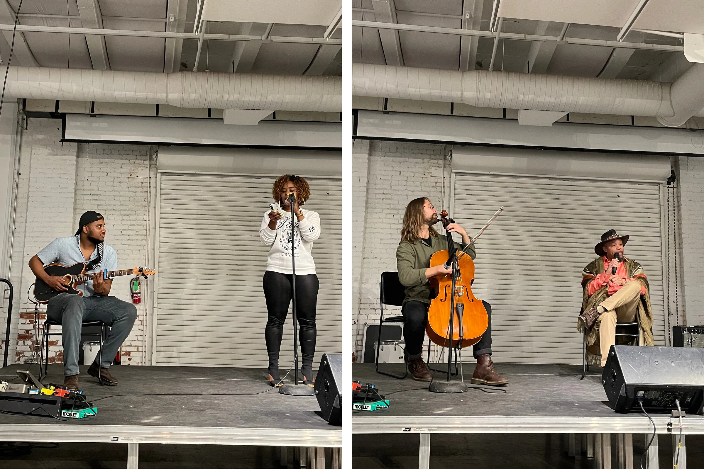 Romel Poetry and Eric Ryan-Johnson were next. Ryan-Johnson’s folky, bright mandolin and fiddle were an unexpected counterpart to Romel’s spoken word, but there was a magic to the musician’s looping tactics and pensive tone mixed with the poet’s introspective reading. Chardonnay, originally from Cleveland, and Avery Marshall, singer/songwriter, were the last announced performers. Marshall’s guitar was mellow and well paced and sang a full song beside Chardonnay’s “wet ink,” a brand-new piece that felt more complete than the writer suspected. It felt like both artists were leads.