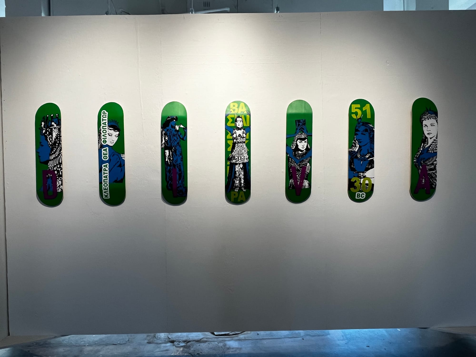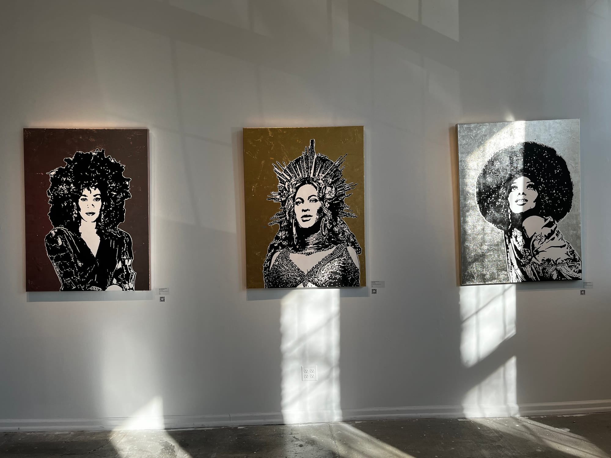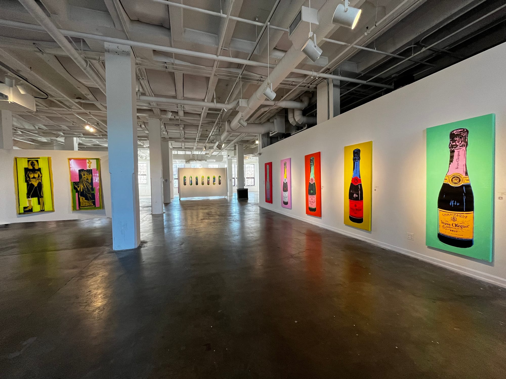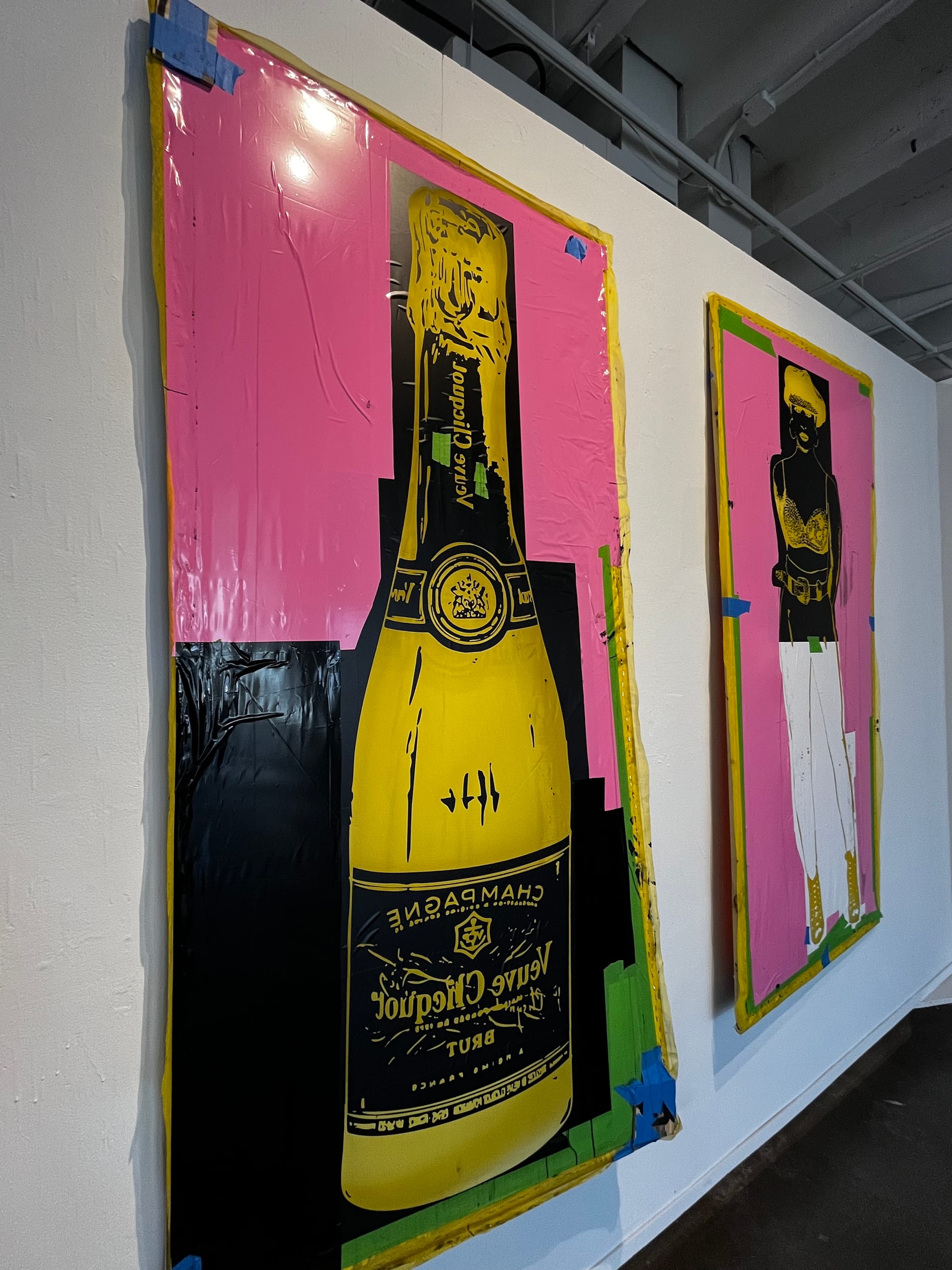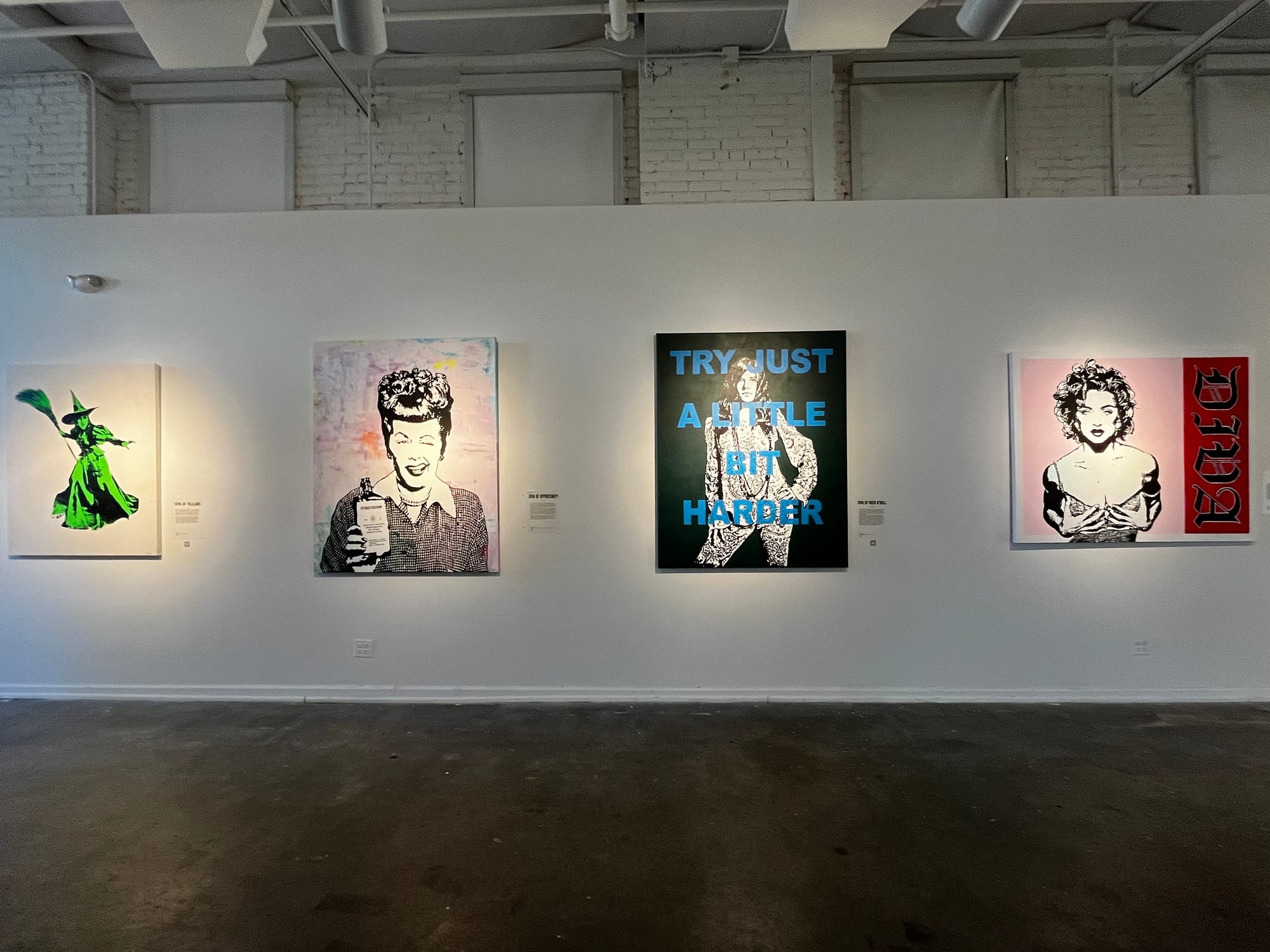 Henson is a gifted pop-art stylist with some real art-business savvy who has her art up in the online Saatchi Gallery and has done commissions for the BOK Center. The massive body of work in “DIVA” featured her giant portraits of iconic women along with tiny, more accessibly priced portraits of others like Chappell Roan, Marie Curie, Maya Angelou, Billie Jean King, and Barbie. Skateboards painted with depictions of Cleopatra took up one wall; huge Warhol-inspired Veuve Clicquot bottles lined another.