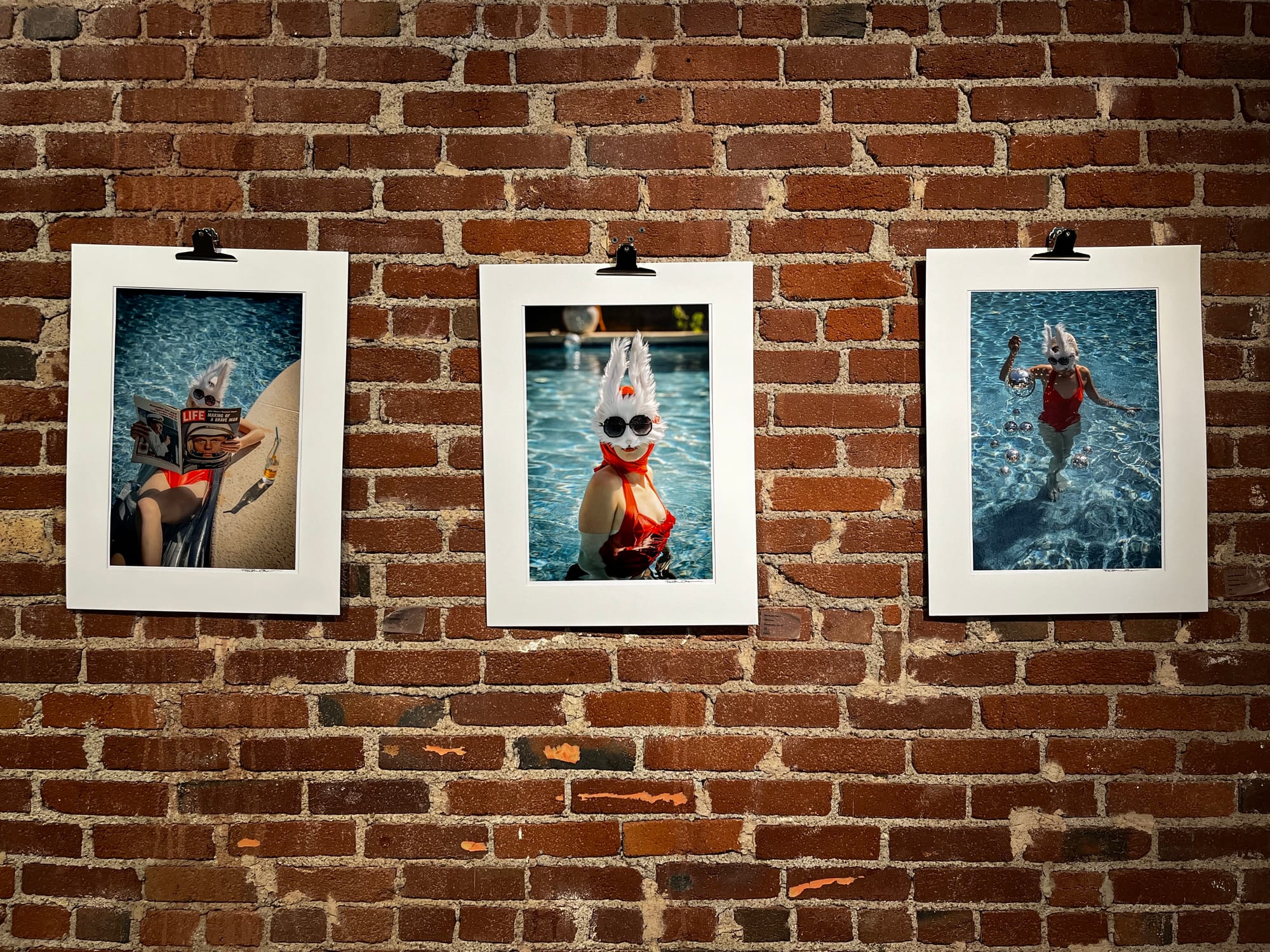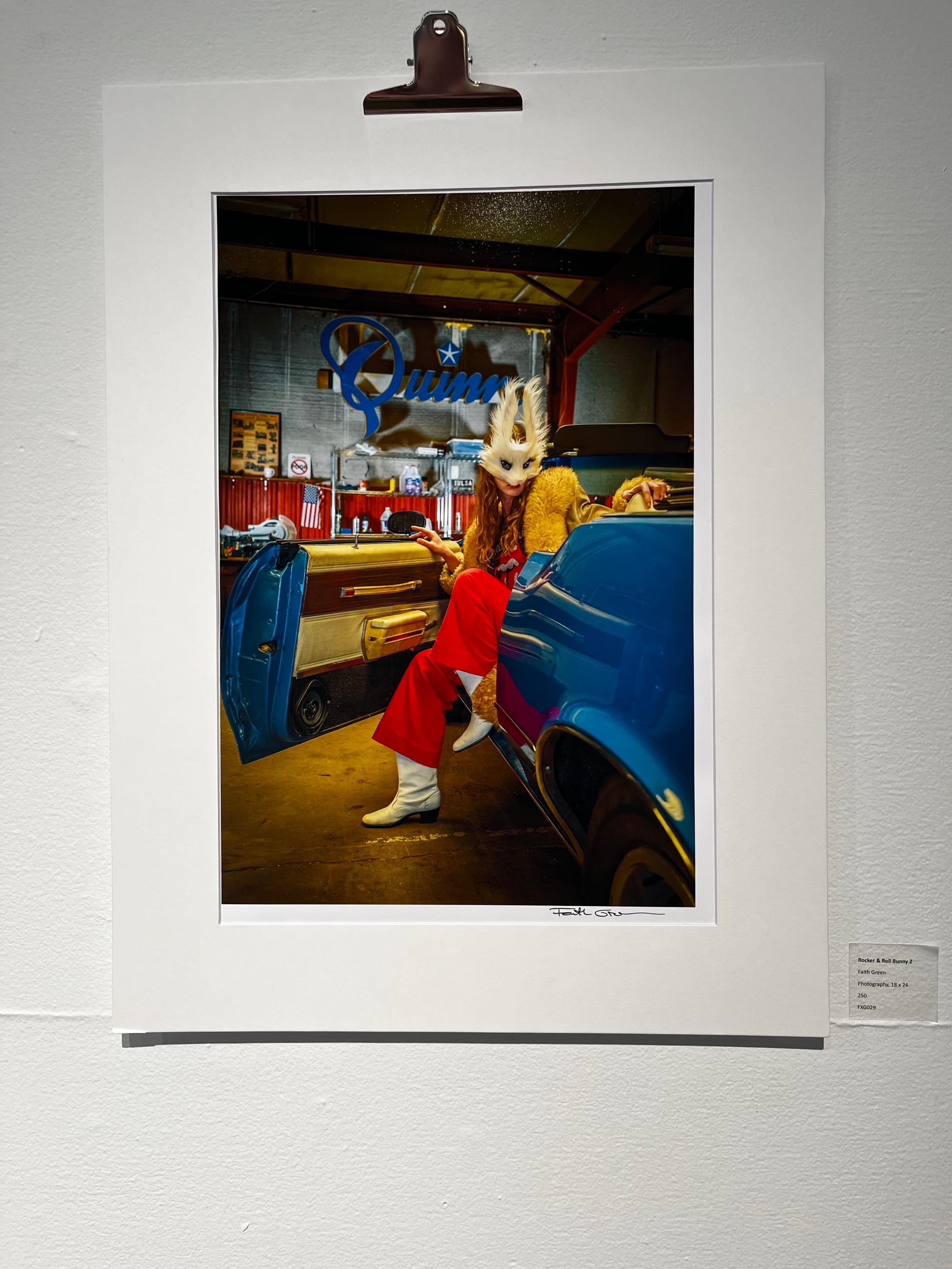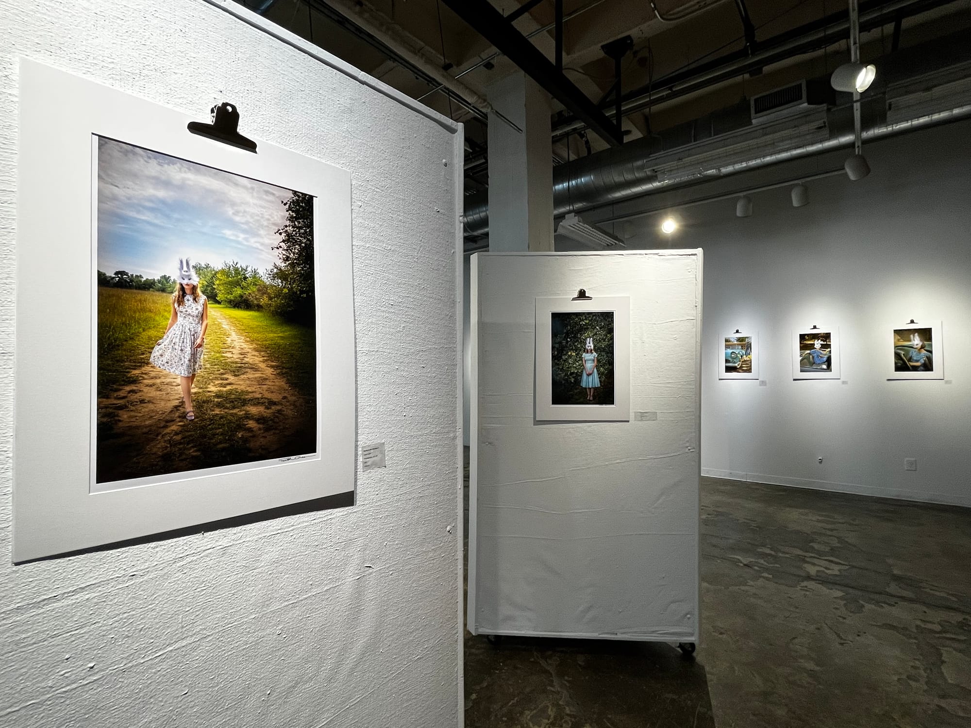 Green is a real estate home stager whose own design chops inform her photographs of her character “Girl Rabbit,” seen in situations both recognizable and fantastical. We see Girl Rabbit lounging in a vintage car. Sashaying down a meadow path and a downtown street. Standing on a moonscape. Dressing up as Marie Antoinette. Playing tennis. “Who is she? Where is she going? Where has she been?” asks the wall text. “She gives you the first pages of the story and only you can finish it. She is on a journey of her mysterious life. You can fill in the blanks of what she is trying to tell you, the viewer, what she is waiting for. Let her take you places in your heart.”