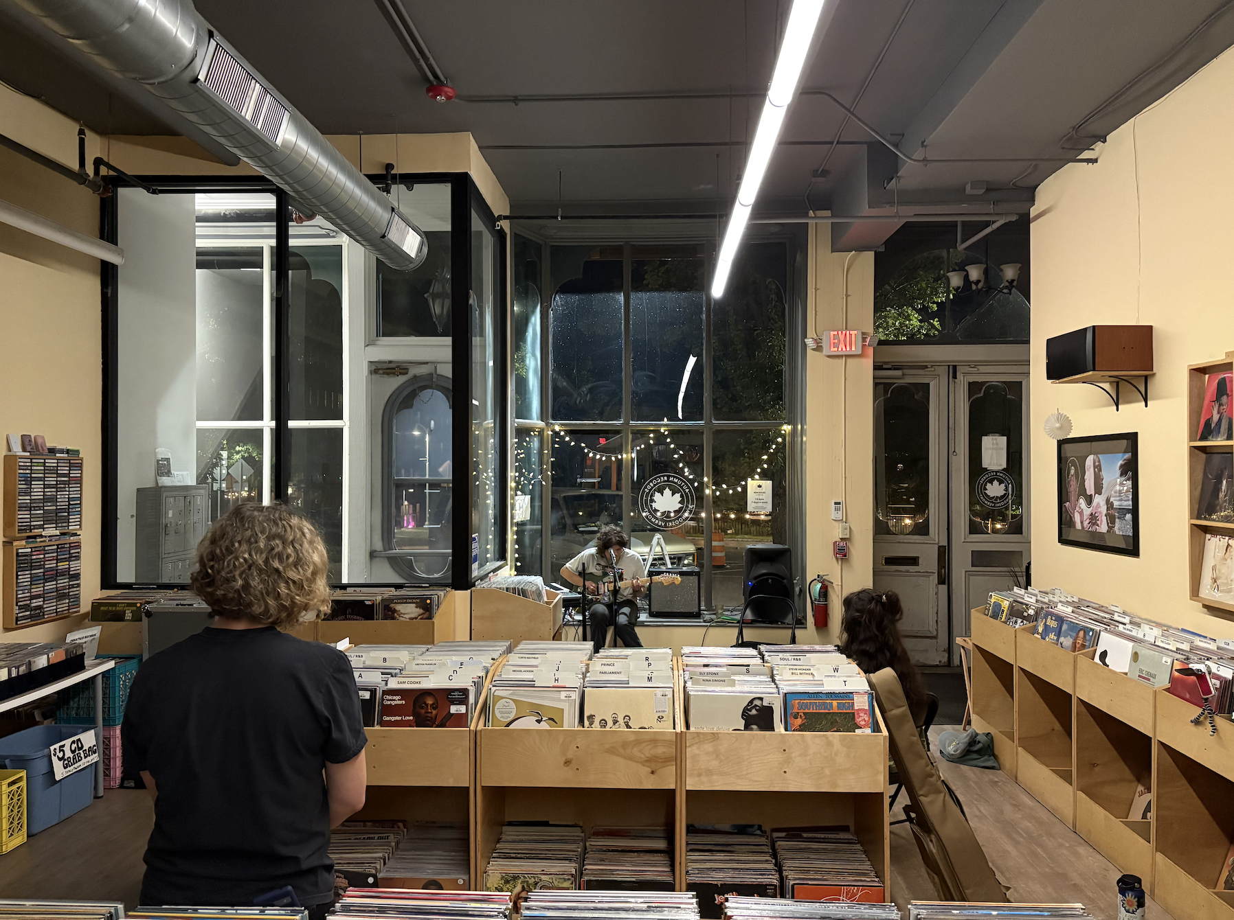 Furthermore, this place has surprisingly great acoustics! I don’t know if it’s something about the brick walls, or the shape of the space, or the way thousands of records and racks absorb or reflect sound, but even while singing and playing without amplification there was a natural reverb and dimension to the sound in the room. When the room sounds good, you’re already winning; from there, performing for a small group of attentive listeners, surrounded on all sides by inspiring album artwork, you can’t help but feel your life choices validated, your decision to drive here vindicated. I’d been following the Autumn Records Instagram page, where they frequently post enticing videos of the shows they host after-hours in the shop, so I’d anticipated a warm, inviting atmosphere and tacit encouragement to do whatever we wanted; there’s something extra fun about playing in a space that doesn’t bat an eye at outsider or weirdo music and art. It gives you license to improvise, to try some new things. Reunited with the tote bag I thought I’d lost in Brooklyn after the Sultan Room show – turned out I’d left it where I crashed that night – meant I’d regained the opportunity to utilize my Ebow (a battery-powered device that creates an electro-magnetic field, which can cause a single steel string, such as on a guitar or a banjo, to vibrate infinitely). I put my banjo flat on the floor and wrapped the strings lightly in a heavy strip of paper, then set the Ebow in motion, making a droning and rattling sound which accompanied me as I sang and played acoustic guitar. Nothing terribly inventive, but fun to know this was the ideal space to try that sort of thing, excitedly unsure if it would even work well with my songs. This show was a blast; I sincerely hope I’m lucky enough to play here again.