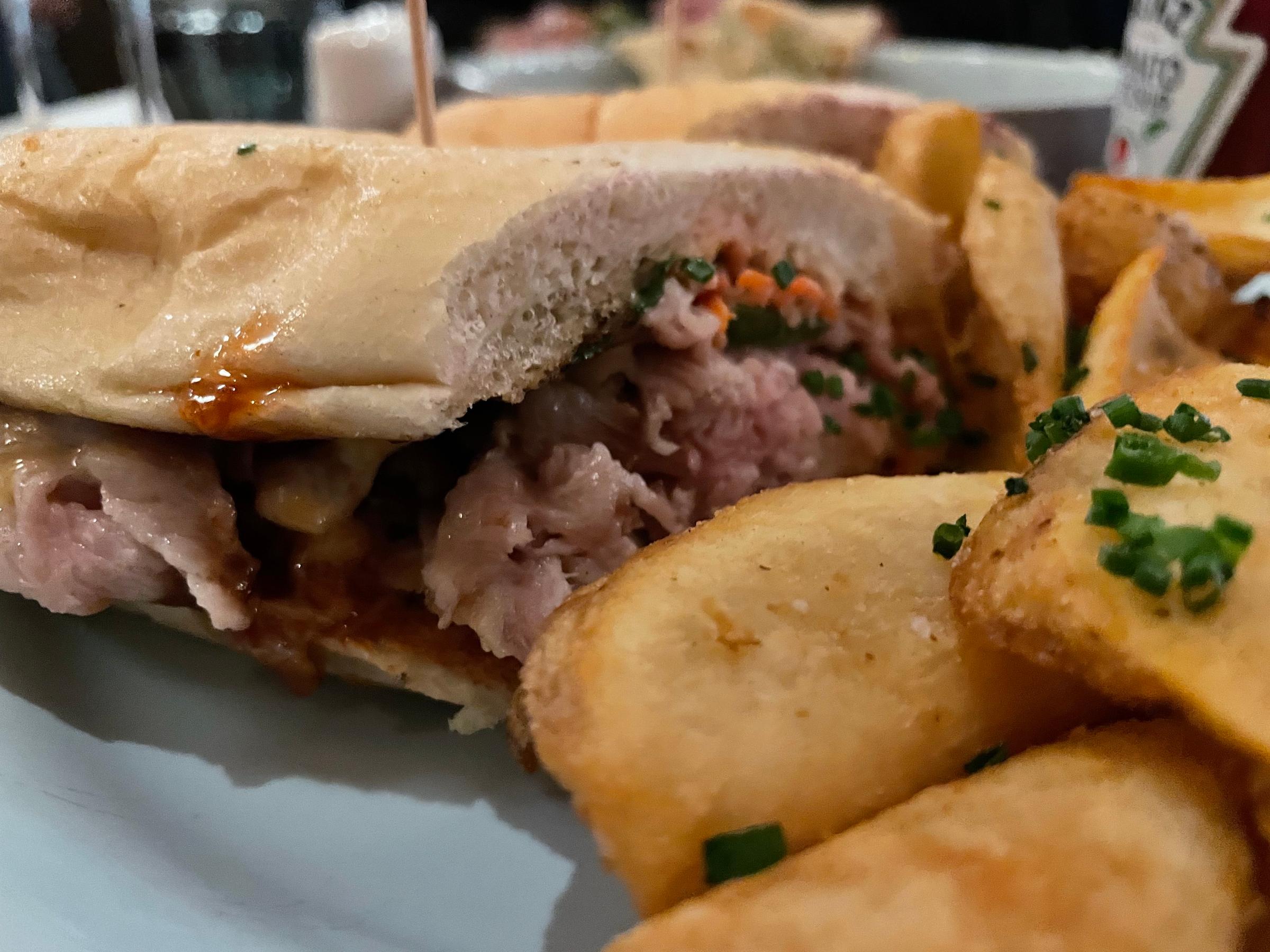 The menu is confident in its mix of cuisines and flavors. After a Mediterranean intro, I moved to Vietnamese fusion with the pork banh mi. The sandwich was packed with flavor, with a splash of mayo taming the Asian BBQ sauce and sliced jalapeños. It might sound strange, but my first bite was reminiscent of a roast beef sandwich. It wasn’t the flavors, but the cut of the meat: I’d never had pork sliced so thin. The texture sent me somewhere both familiar and foreign.
