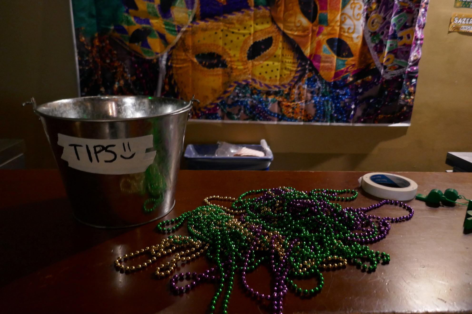 It’s true that this year was noticeably affected by the football hangover. Still, Lake Chalet brought in all the elements to cheer people up. As soon as I arrived, the hostess placed a string of beads around my neck and smiled brightly. “Enjoy the party!” she told me as she led me to the lakeside area outdoors. DJs spun big-band NOLA party music, there were Hurricane and Sazerac drink specials on offer, and the crowd of hopeful partygoers dressed in light-up headgear, beads, and spangly outfits grew throughout the night. For some people, Mardi Gras is the Super Bowl of partying.