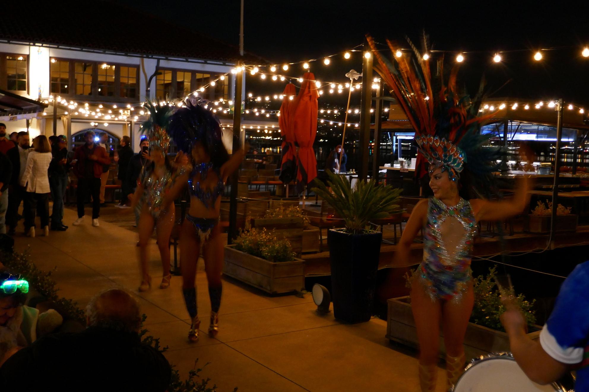 I was sitting on the outdoor patio on Tuesday night, admiring the nighttime views of Lake Merritt, when a musician banging out a party beat on a snare drum came dancing down the stairs, followed by a scantily-clad dancer in a glittering suit and towering feathered headdress. She started cha-cha dancing down the main walkway, followed by another dancer in similar attire, then another. Nearby, a guy started to cheer at the spectacle, maybe a little too excitedly. “Calm down, calm down,” his friend reassured him. “Let’s pace ourselves.” Words of wisdom when it comes to celebrating Mardi Gras, whether in NOLA or in Oaktown.