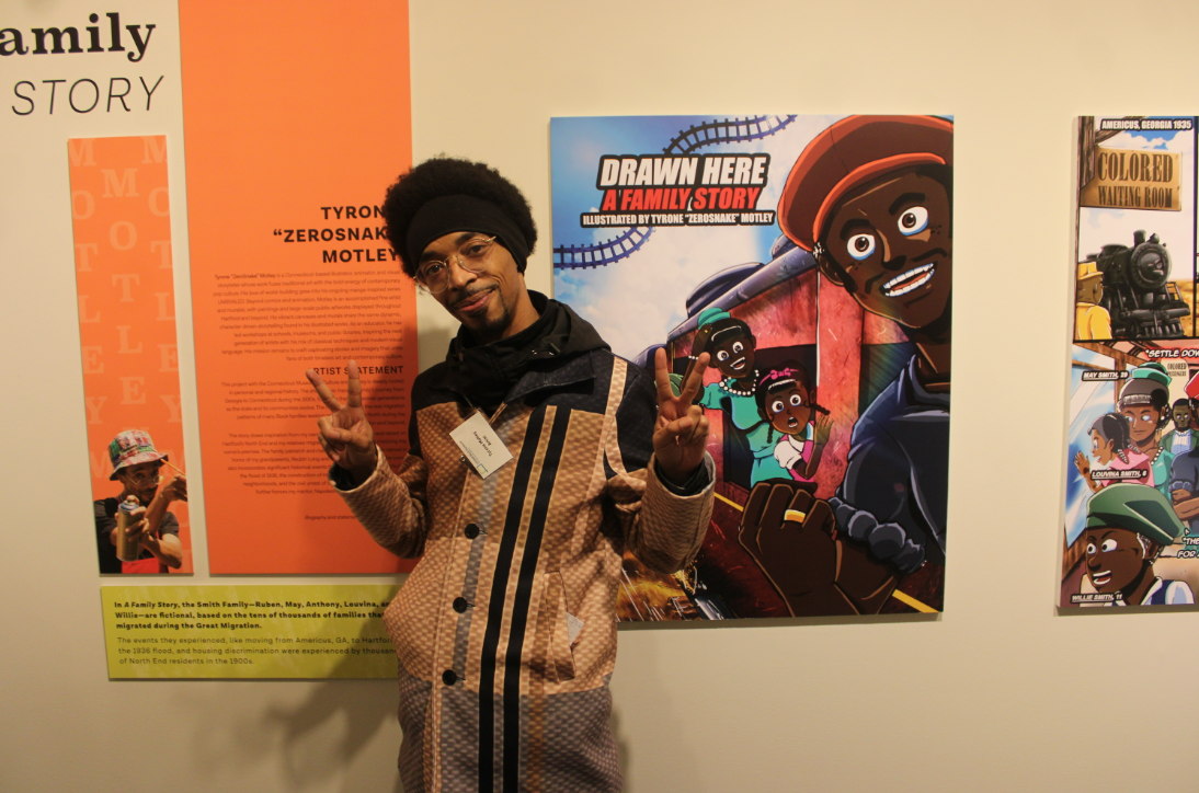 The oral histories are only a part of the overall exhibit, which covers most of the museum’s third floor. Another standout element of the exhibit is the original art contributed by the talented team. The walls of the exhibit were covered by stories told through comic book-style art that leapt out at viewers. Tyrone “Zerosnake” Motley contributed A Family Story, which follows the fictional story of the Smith family on their journey from Georgia to Hartford. The story resonates with me, as my mother made the same journey from Sylvester to Hartford.