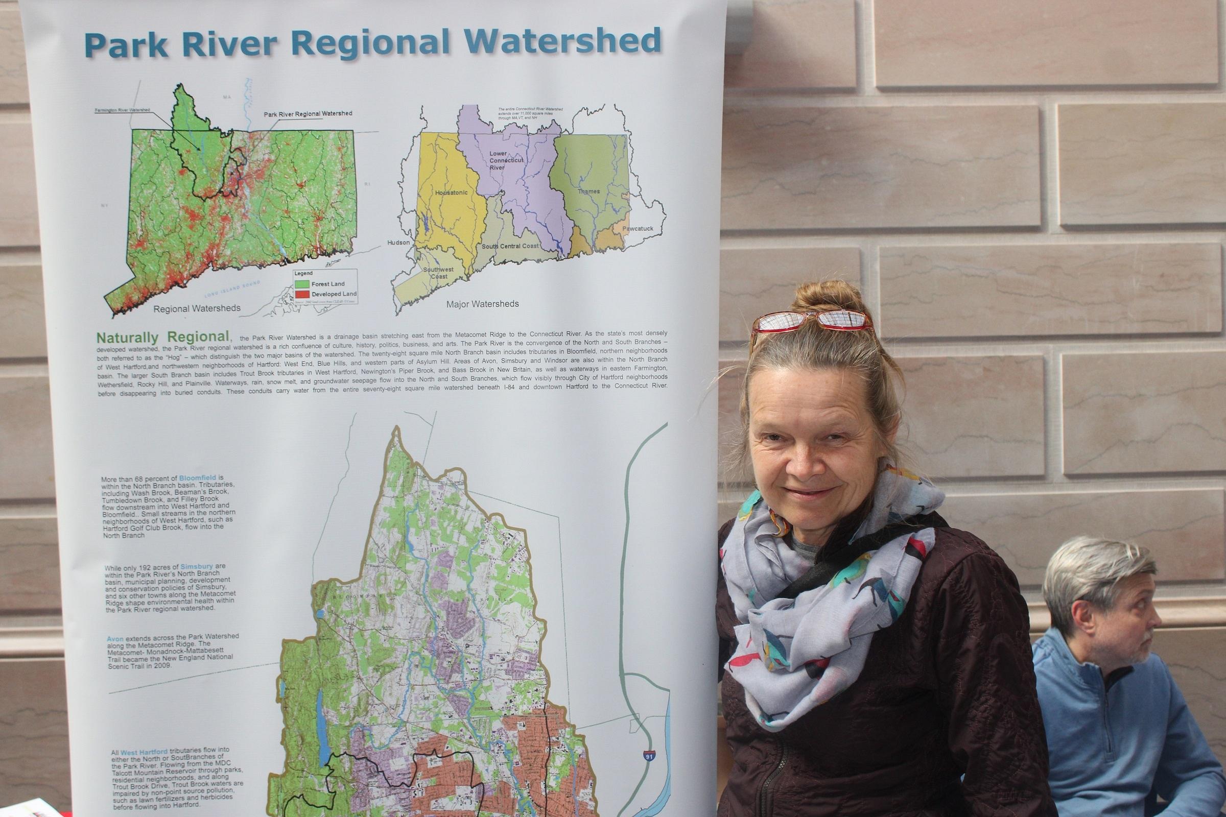 The most interesting booth of the day to me though was about midway through the gathering. There I met Mary Rickell Pelletier, the founder of Park Watershed. Her organization is dedicated to “citizen stewardship of nature in our neighborhoods,” particularly surrounding the eponymous 78-square-mile Park watershed, which covers almost all of Bloomfield and West Hartford and parts of nine other towns in Greater Hartford.