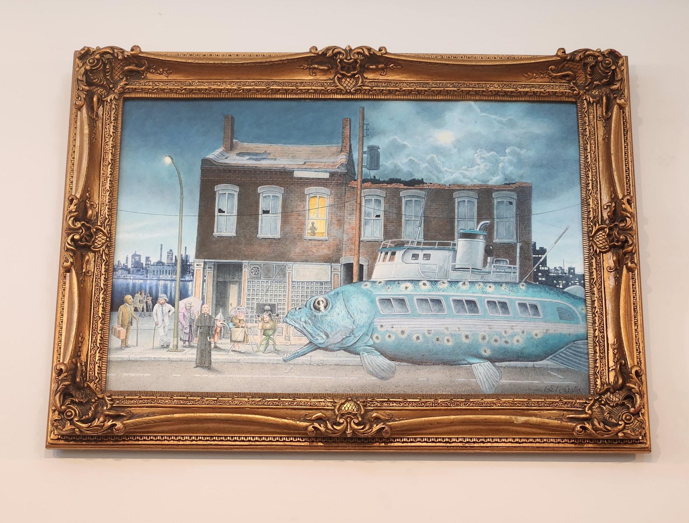 Weber’s works are scattered across the walls, both constructed and original, and for good reason. His oil paintings, ranging from quite small to several feet across, are slightly unsettled but dreamy, a world reimagined through the lens of a true, weird, Bay Area artist. With the dreamy haze of Dali and Miyazaki, he weaves snapshots of alternate, or perhaps future, worlds. Transitional light and strong, cotton candy skies, a blue cast on many scenes, dampened, dank. Fitting for a fish (bus).