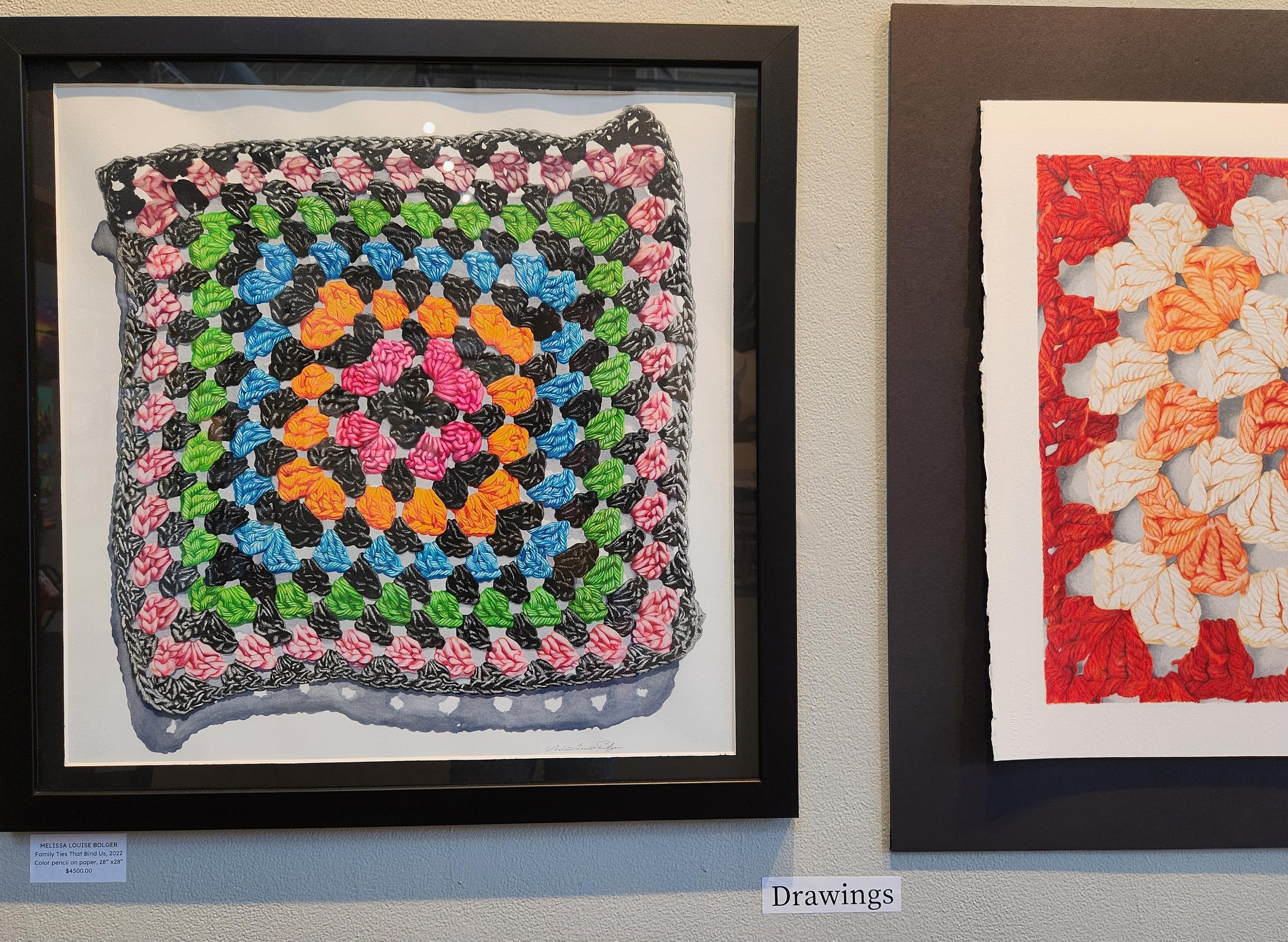 I marveled at the skill and finesse of several artists, such as Melissa Louise Bolger and Ron Norman, both of whose large, photorealist pencil drawings were arresting, albeit for rather different reasons. Bolger’s “Family Ties That Bind Us” and “A Piece of Her In Orange,” both of which are 28”x28” crochet granny squares expertly rendered in colored pencil, ooze sweetness and affection, love and familial reflection.